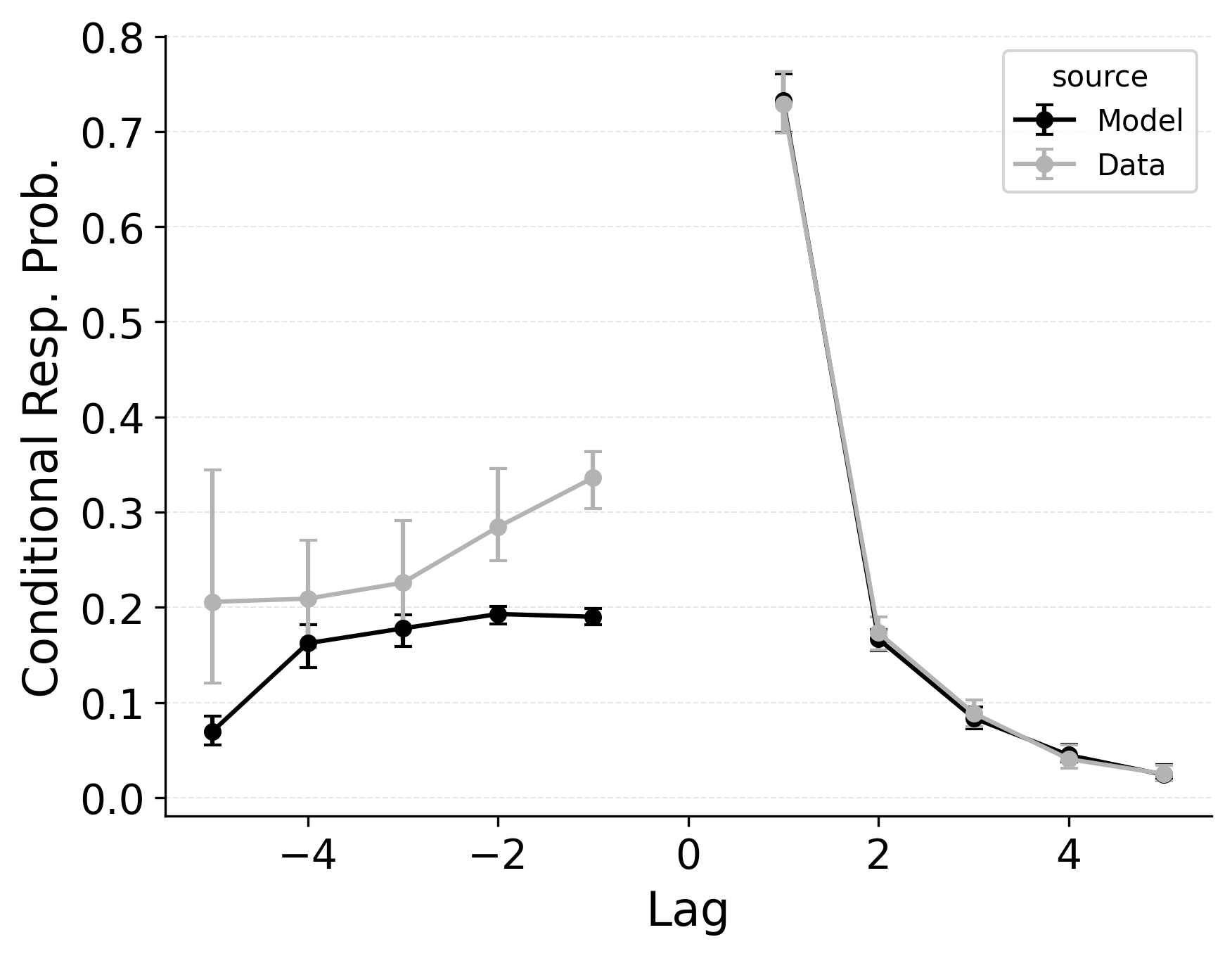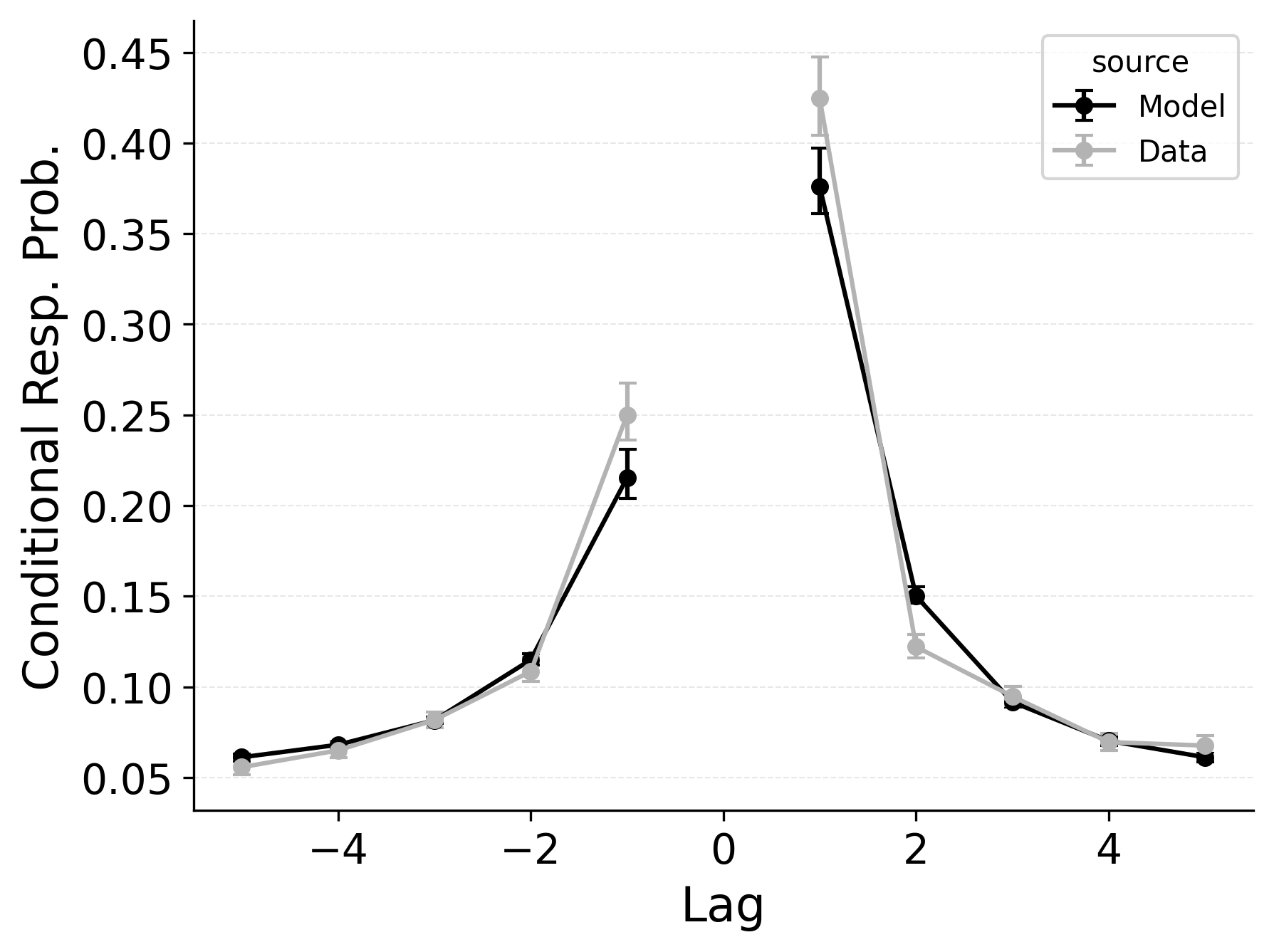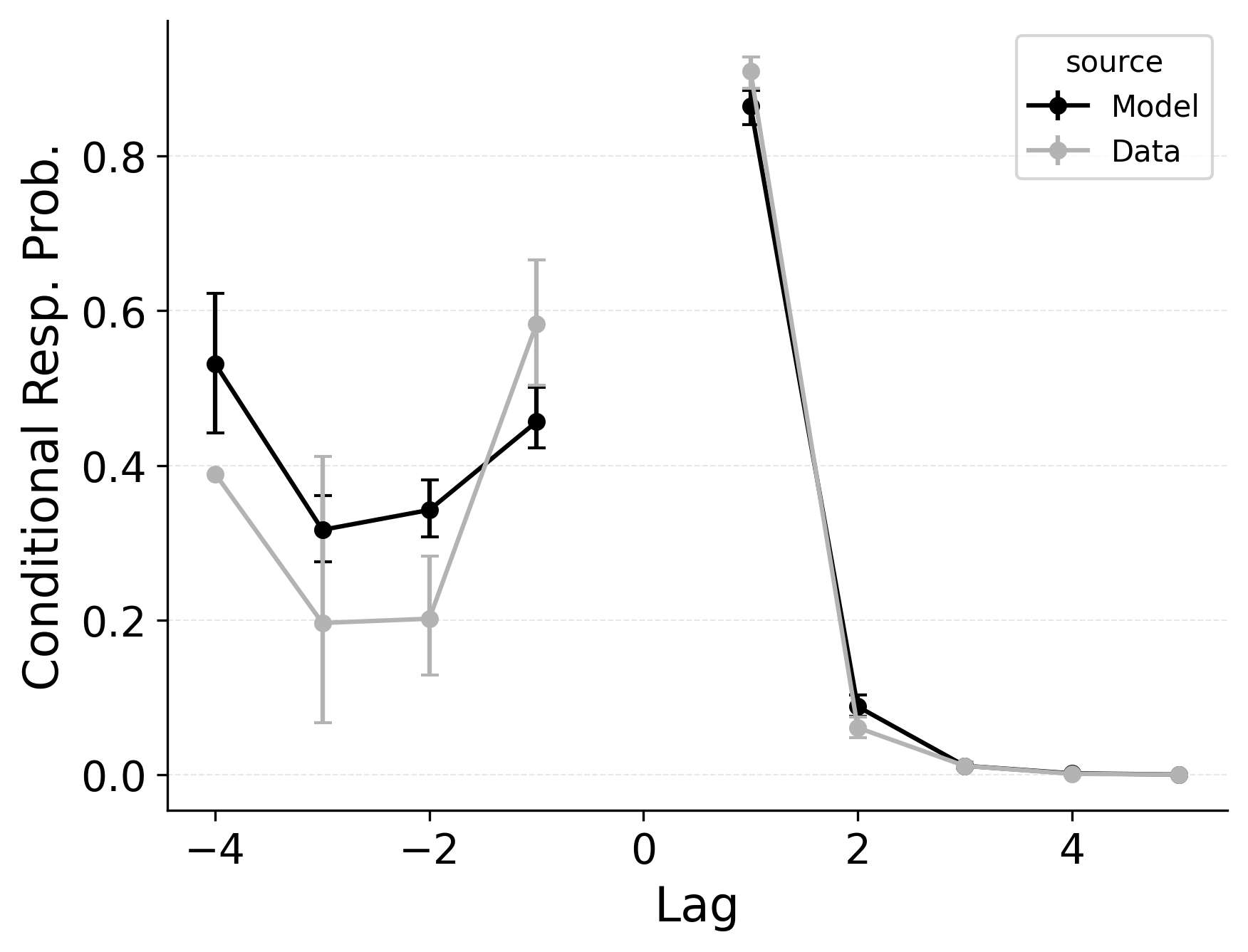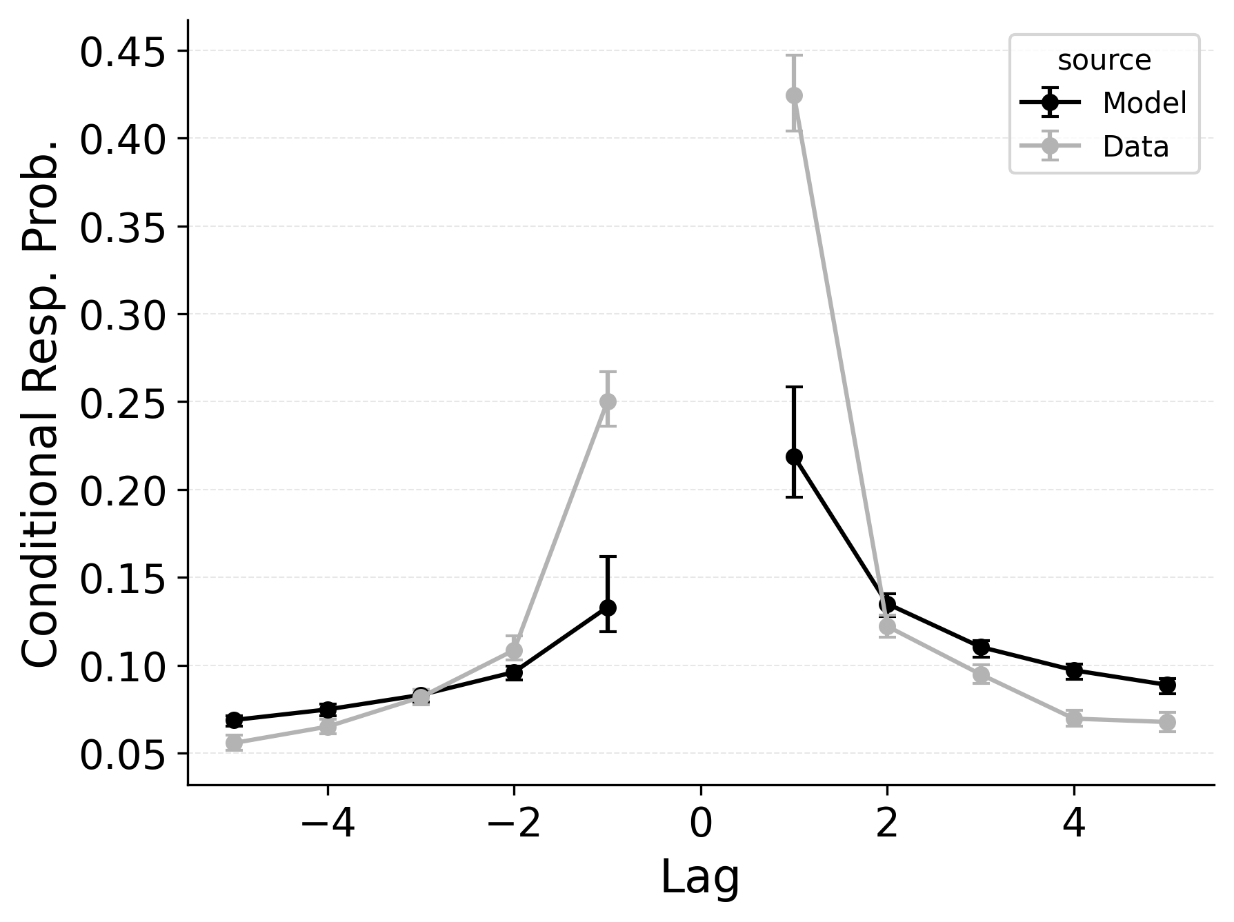 Serial recall and free recall both show clear temporal structure in participant’s sequence of recall transitions, as characterized by the lag-CRP analysis. In strict serial recall, participants typically move forward through the list (i.e., +1 transitions are highly likely), yet small but reliable rates of backward transitions (e.g., fill-in errors) are nonetheless observed. These fill-in errors occur when a participant temporarily skips a position but later “fill in” the item that was missed, effectively jumping backward one or more steps. Just as in free recall, CMR’s feature-to-context memory (\(\gamma\)) and pre-experimental context-to-feature associations (\(\alpha\), \(\delta\)) provide a means for reinstating earlier list context, thereby increasing the model’s propensity for backward transitions at short lags. Lohnas (2024) observed this capability in an evaluation of CMR for serial recall, but CRU was found by Logan (2021) to also capture applicable backward transitions in the serial recall task.