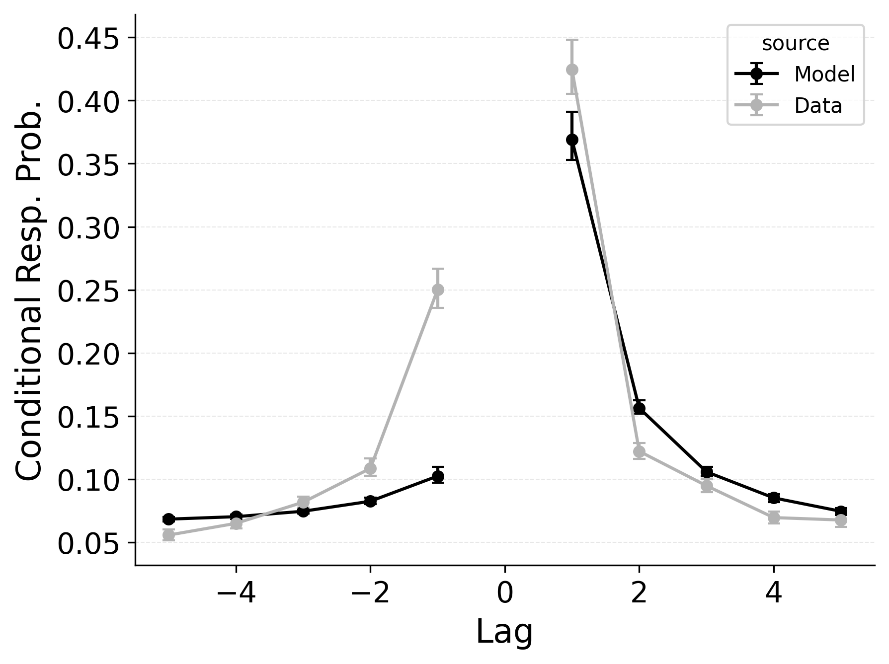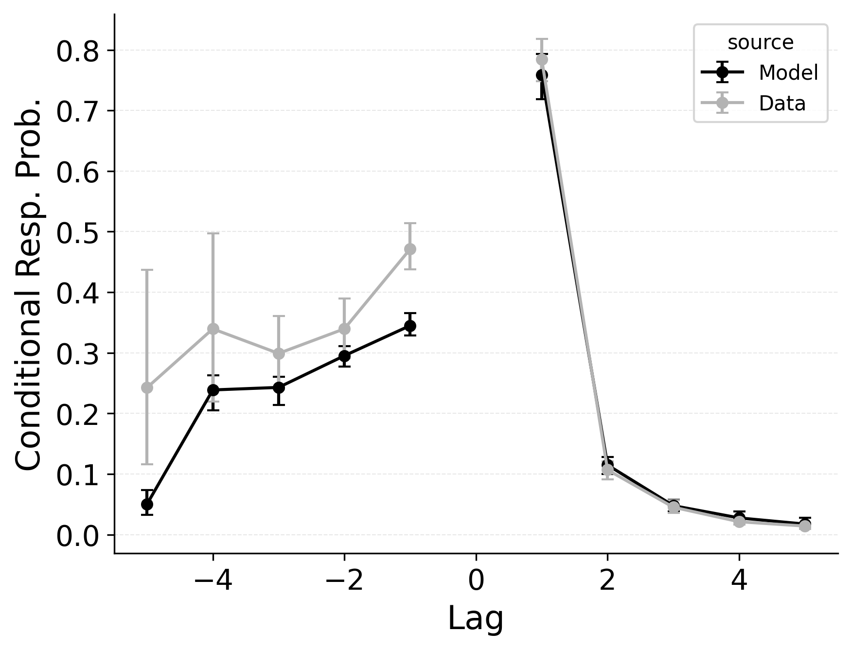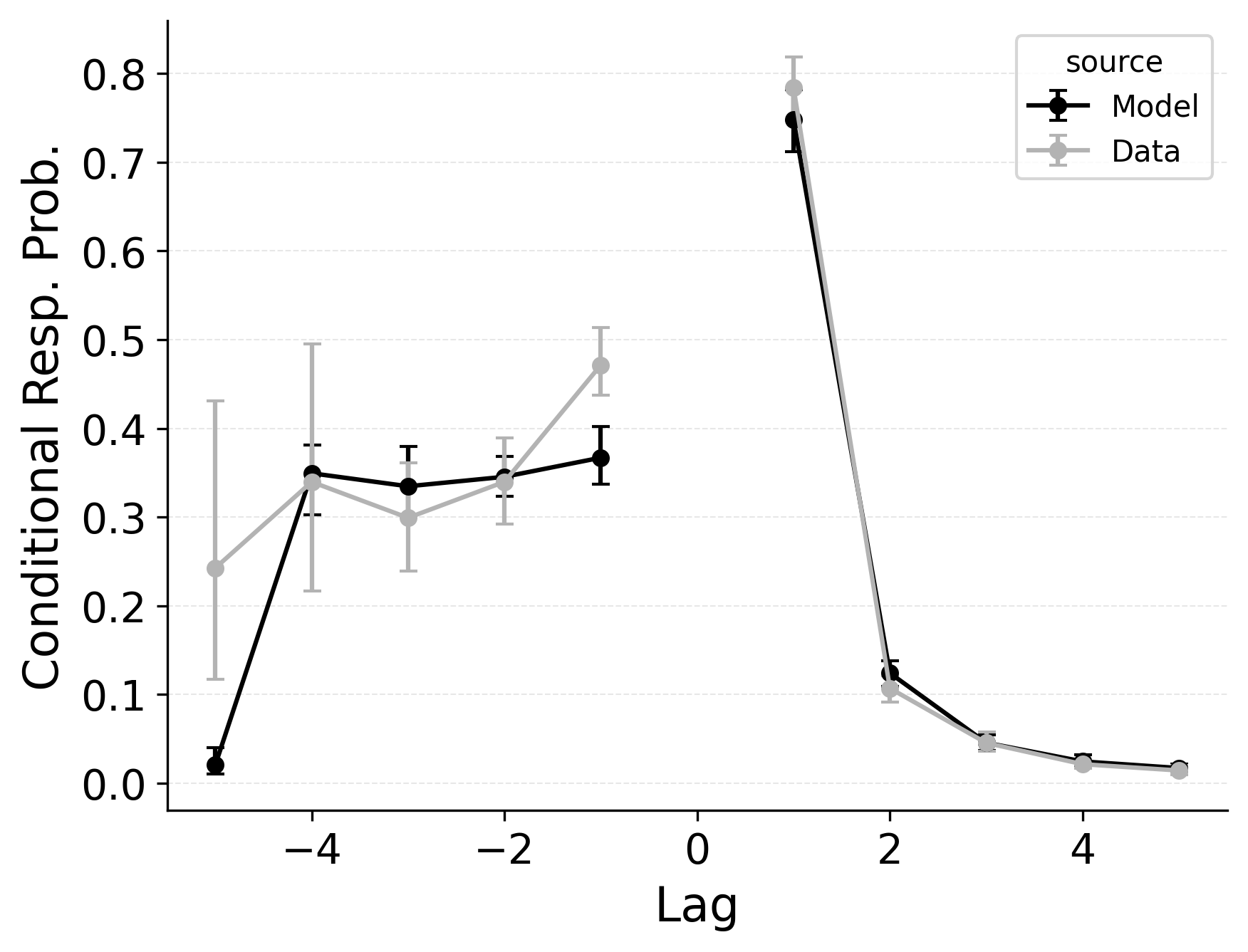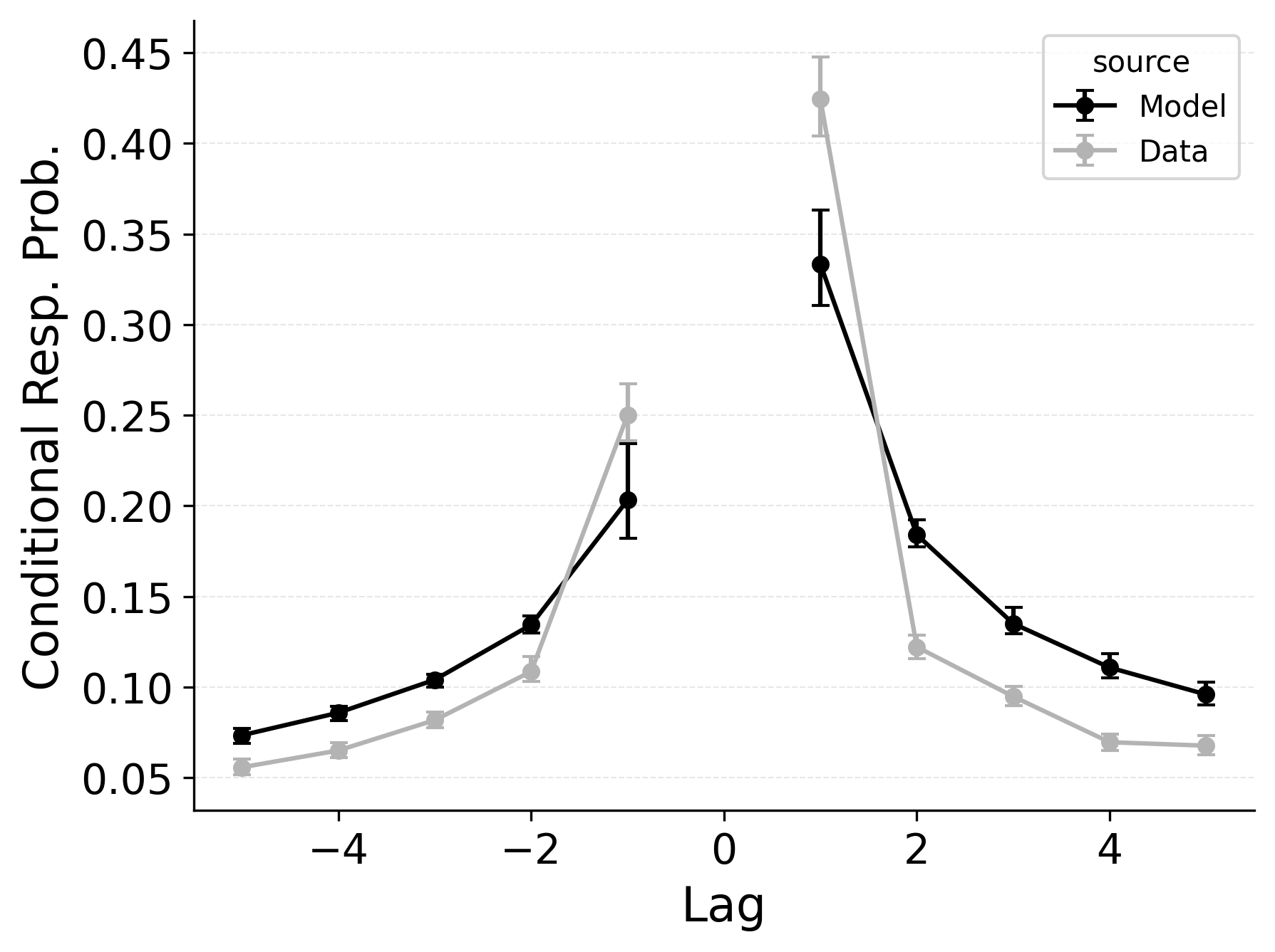 Serial recall and free recall both show clear temporal structure in participant’s sequence of recall transitions, as characterized by the lag-CRP analysis. In strict serial recall, participants typically move forward through the list (i.e., +1 transitions are highly likely), yet small but reliable rates of backward transitions (e.g., fill-in errors) are nonetheless observed. These fill-in errors occur when a participant temporarily skips a position but later “fill in” the item that was missed, effectively jumping backward one or more steps. Just as in free recall, CMR’s feature-to-context memory (\(\gamma\)) and pre-experimental context-to-feature associations (\(\alpha\), \(\delta\)) provide a means for reinstating earlier list context, thereby increasing the model’s propensity for backward transitions at short lags. Lohnas (2024) observed this capability in an evaluation of CMR for serial recall, but CRU was found by Logan (2021) to also capture applicable backward transitions in the serial recall task.