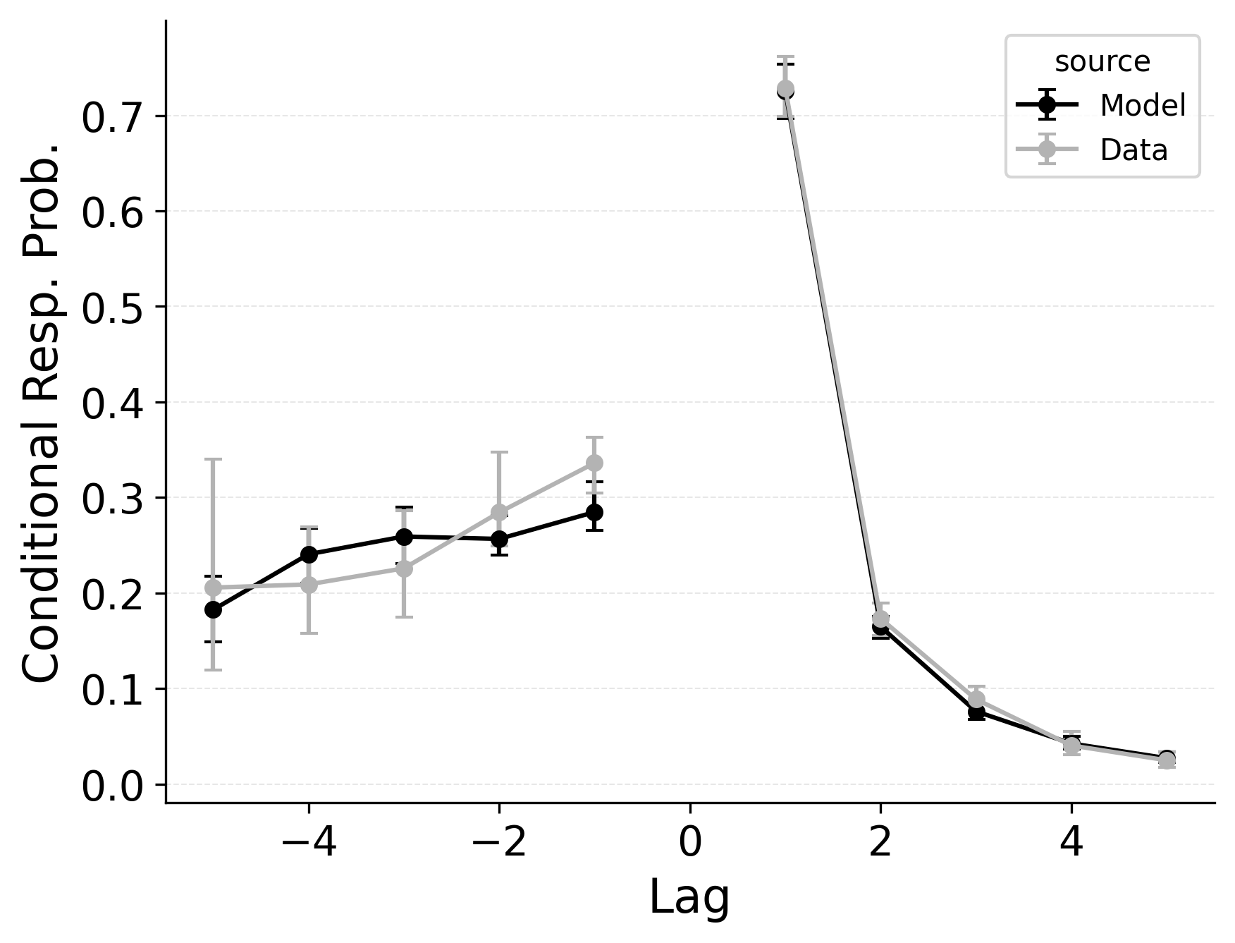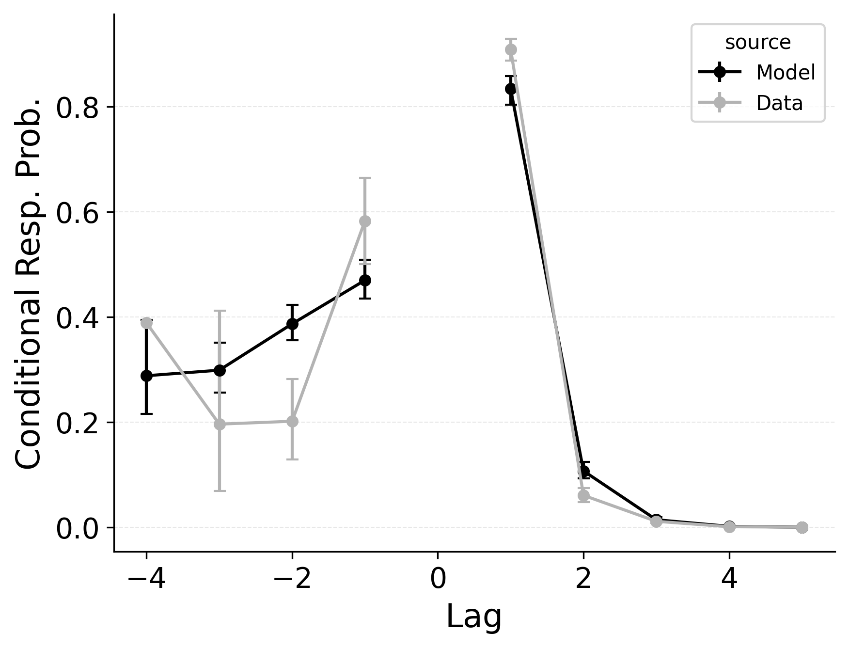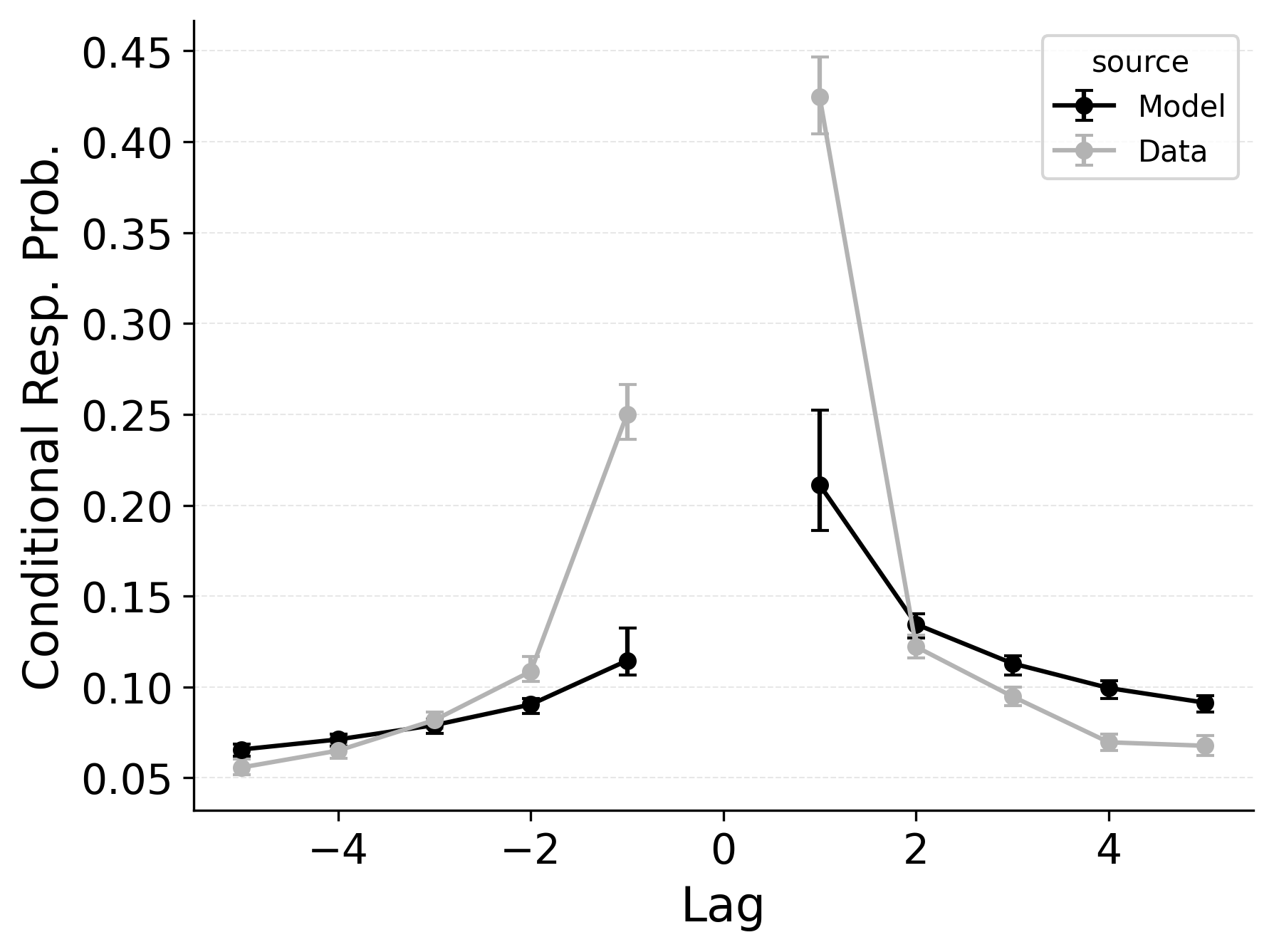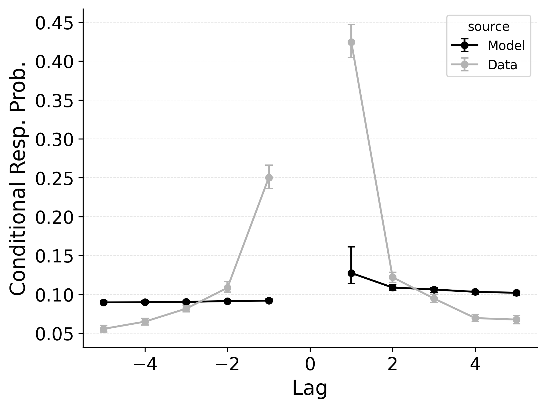 Serial recall and free recall both show clear temporal structure in participant’s sequence of recall transitions, as characterized by the lag-CRP analysis. In strict serial recall, participants typically move forward through the list (i.e., +1 transitions are highly likely), yet small but reliable rates of backward transitions (e.g., fill-in errors) are nonetheless observed. These fill-in errors occur when a participant temporarily skips a position but later “fill in” the item that was missed, effectively jumping backward one or more steps. Just as in free recall, CMR’s feature-to-context memory (\(\gamma\)) and pre-experimental context-to-feature associations (\(\alpha\), \(\delta\)) provide a means for reinstating earlier list context, thereby increasing the model’s propensity for backward transitions at short lags. Lohnas (2024) observed this capability in an evaluation of CMR for serial recall, but CRU was found by Logan (2021) to also capture applicable backward transitions in the serial recall task.