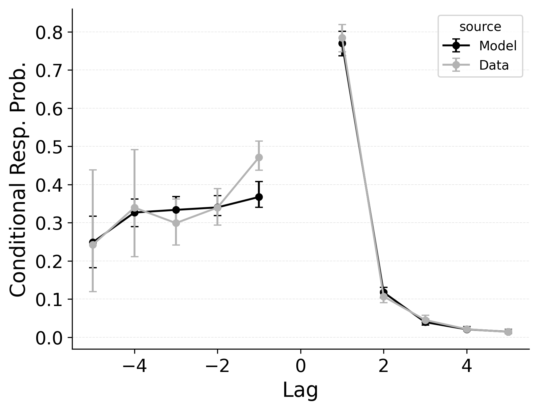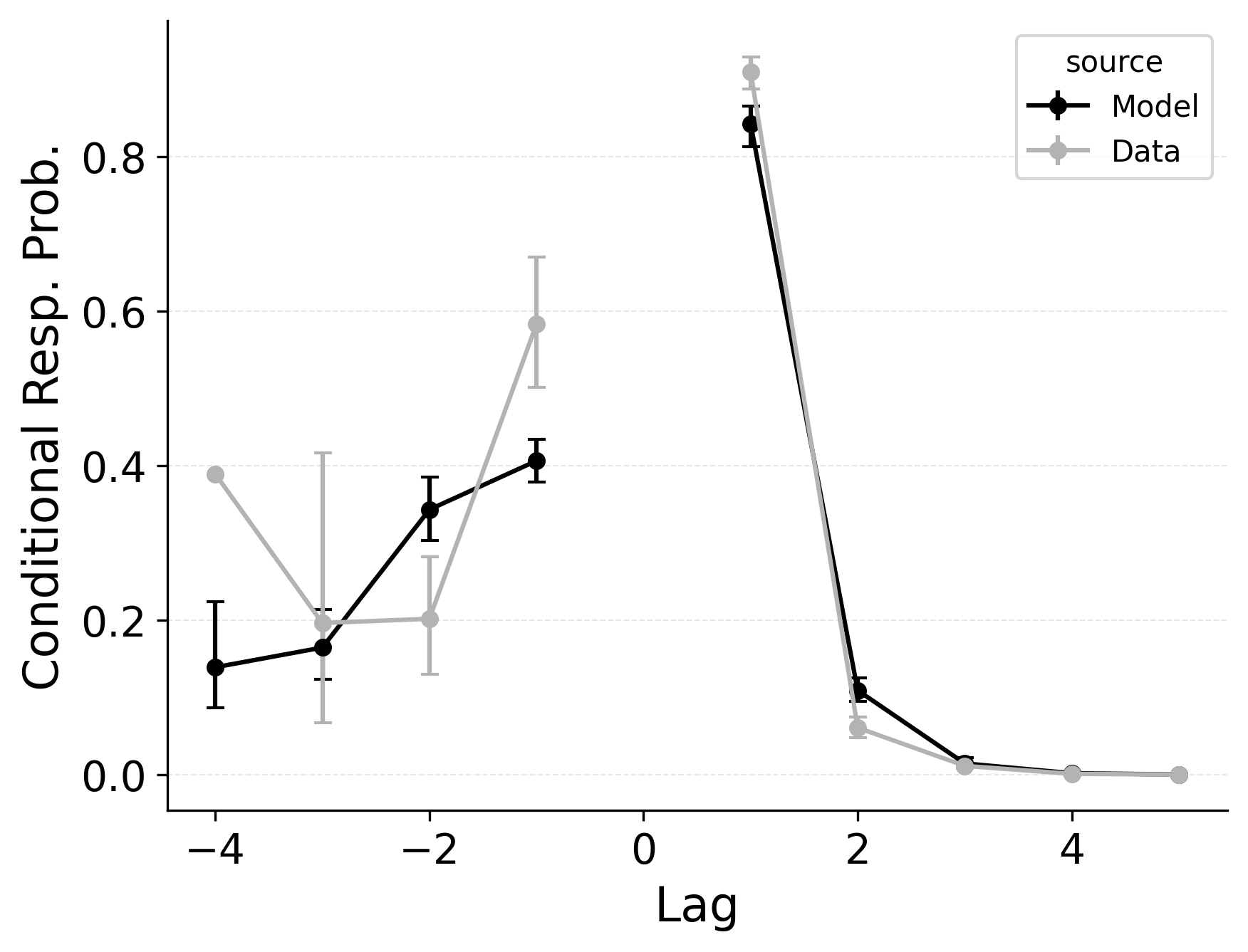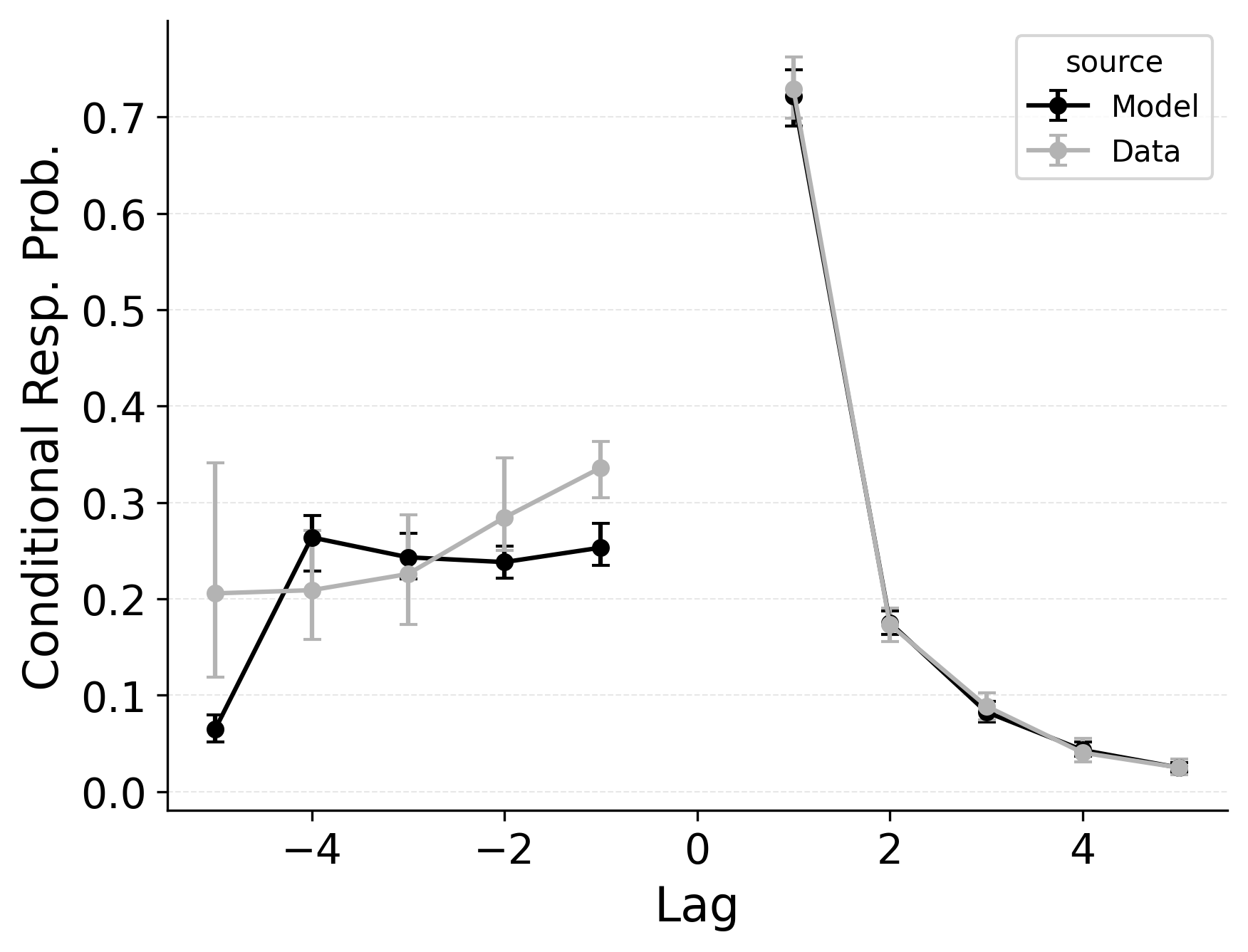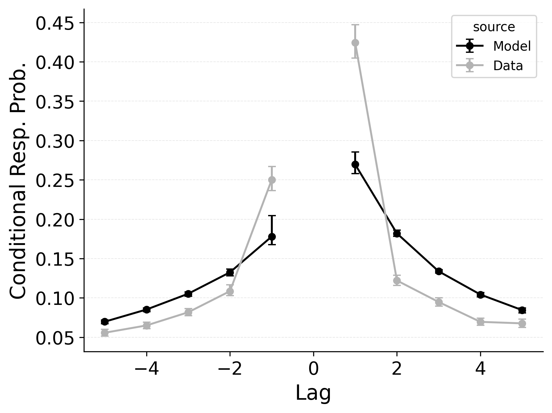 Serial recall and free recall both show clear temporal structure in participant’s sequence of recall transitions, as characterized by the lag-CRP analysis. In strict serial recall, participants typically move forward through the list (i.e., +1 transitions are highly likely), yet small but reliable rates of backward transitions (e.g., fill-in errors) are nonetheless observed. These fill-in errors occur when a participant temporarily skips a position but later “fill in” the item that was missed, effectively jumping backward one or more steps. Just as in free recall, CMR’s feature-to-context memory (\(\gamma\)) and pre-experimental context-to-feature associations (\(\alpha\), \(\delta\)) provide a means for reinstating earlier list context, thereby increasing the model’s propensity for backward transitions at short lags. Lohnas (2024) observed this capability in an evaluation of CMR for serial recall, but CRU was found by Logan (2021) to also capture applicable backward transitions in the serial recall task.