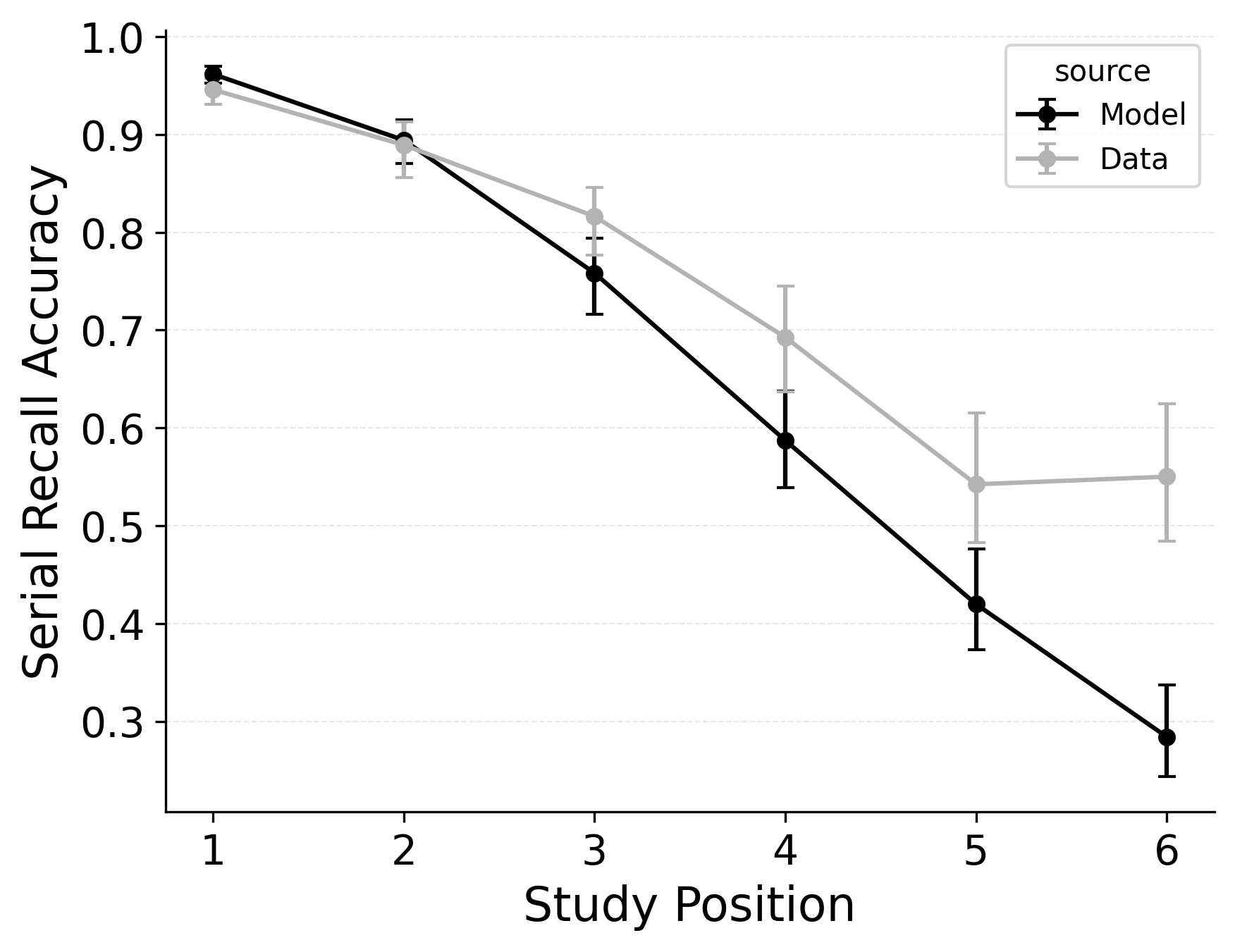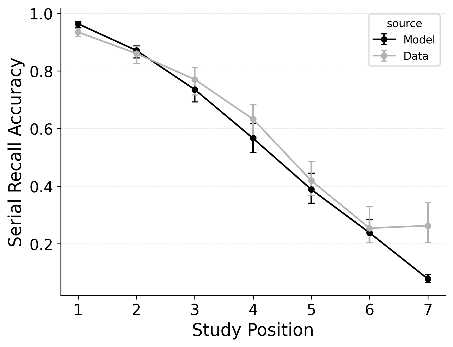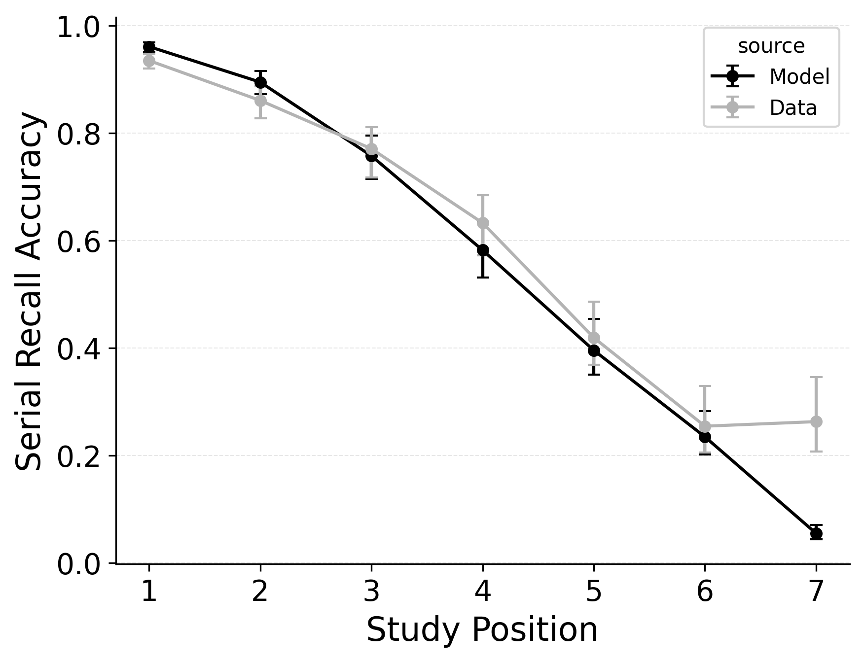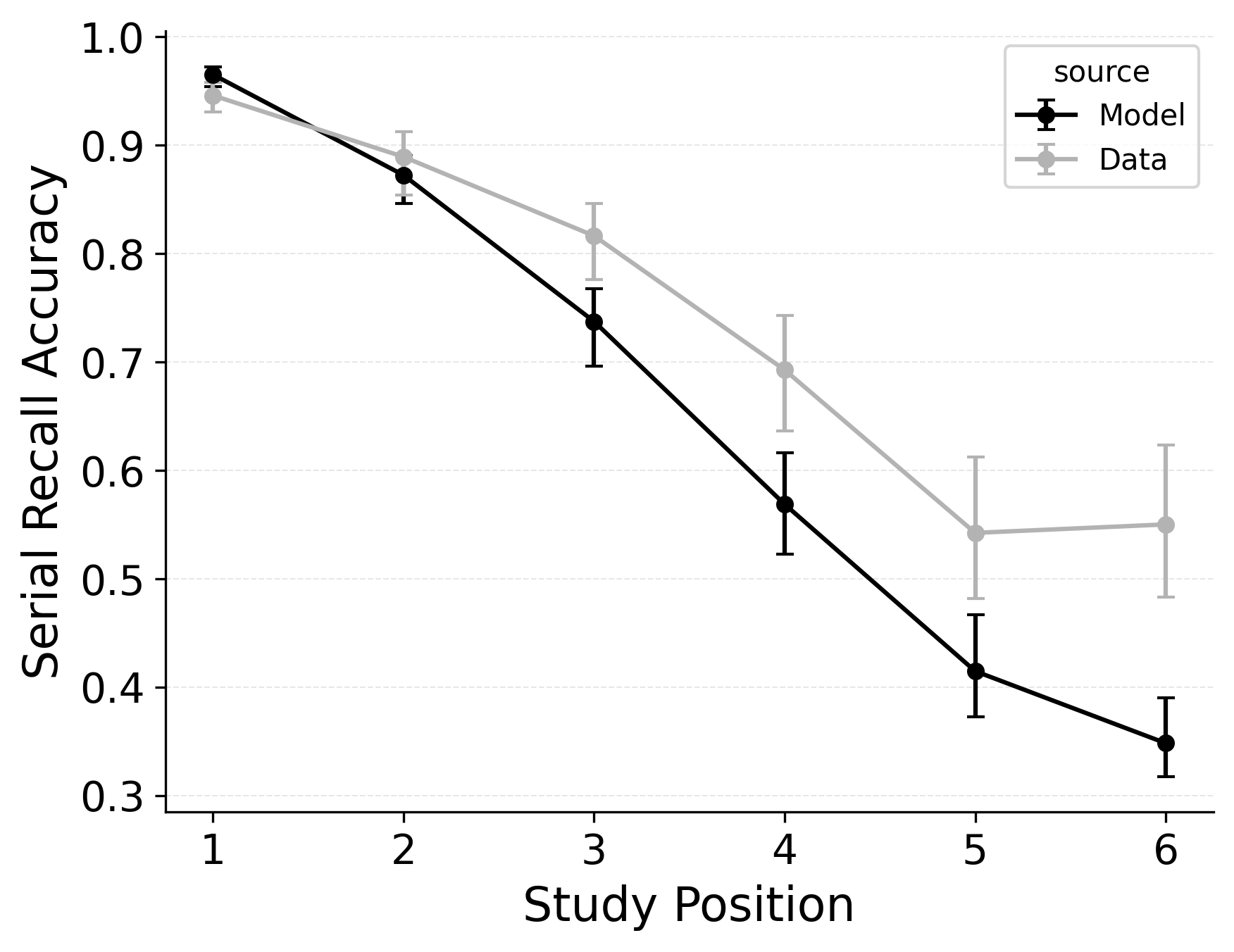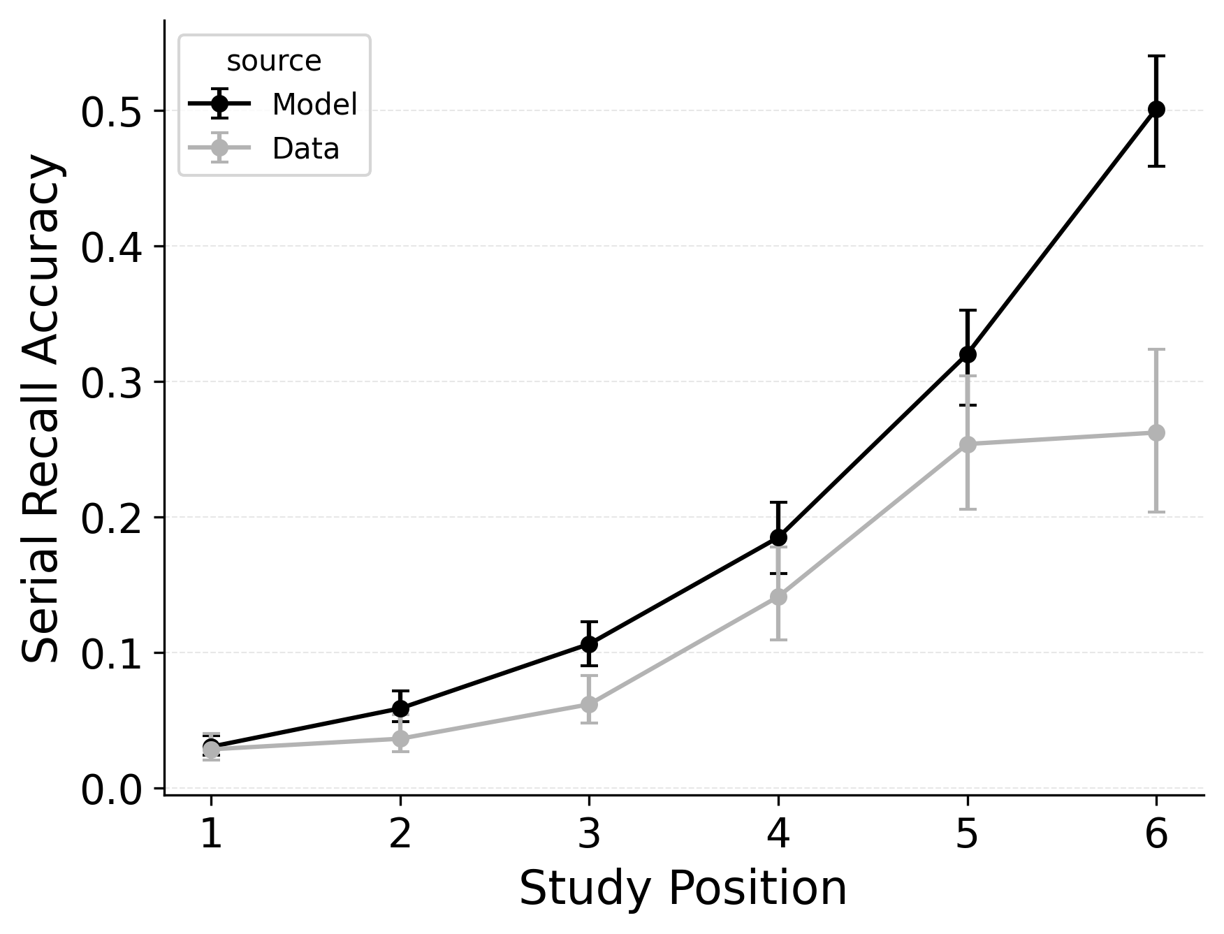 These outcomes reproduce prior results showing that CMR mechanisms needed to balance primacy and recency in free recall become less important in serial recall when the task enforces a fixed forward order (Lohnas 2024; Logan 2021). Because strict serial recall requires reproducing items from the start, it is not necessary to manipulate the \(\beta_\text{start}\) parameter downward from its already maximal value of 1.