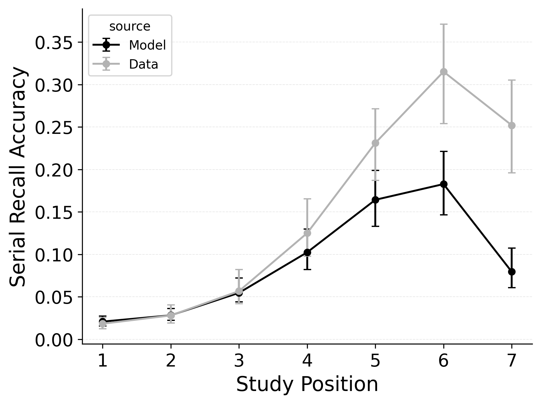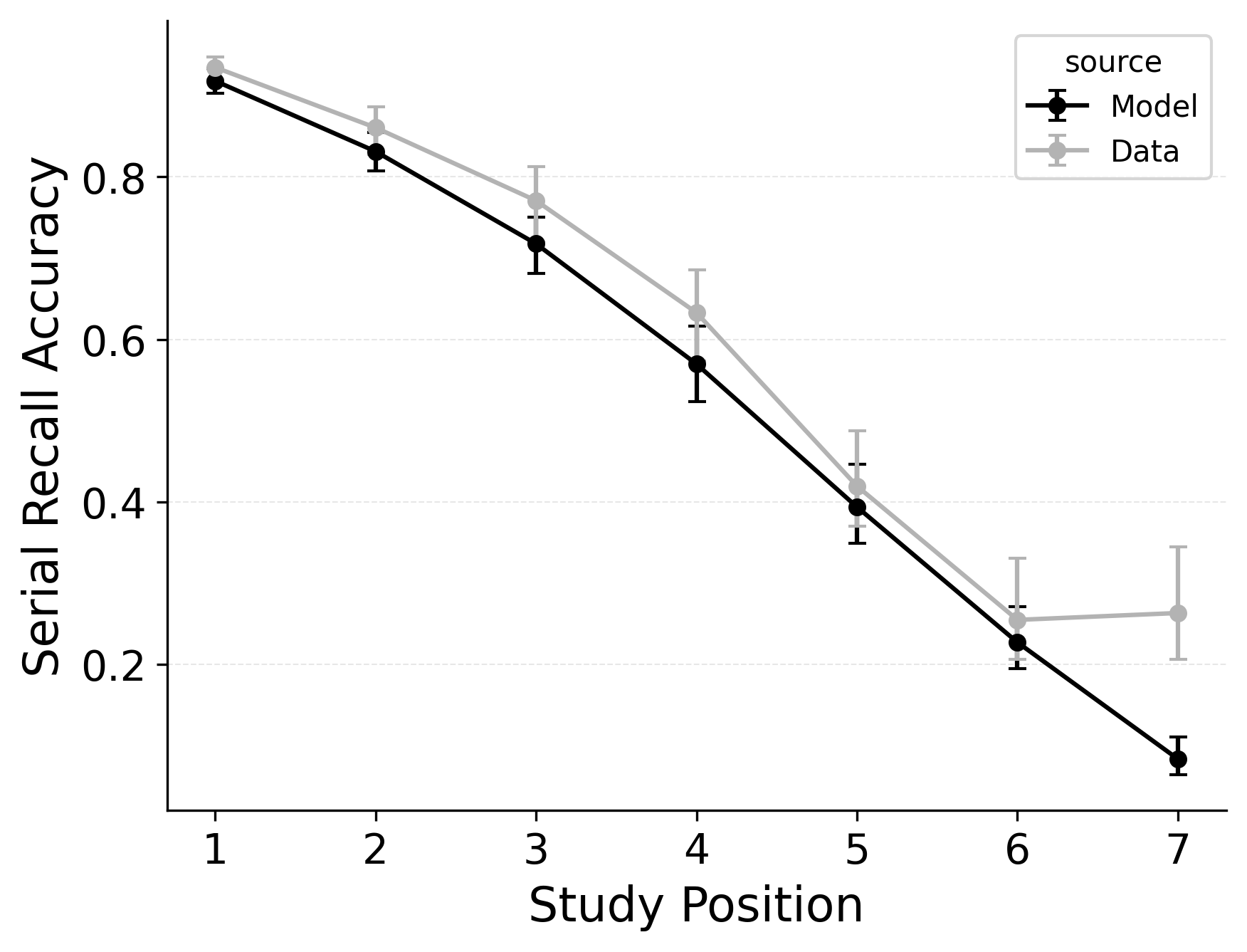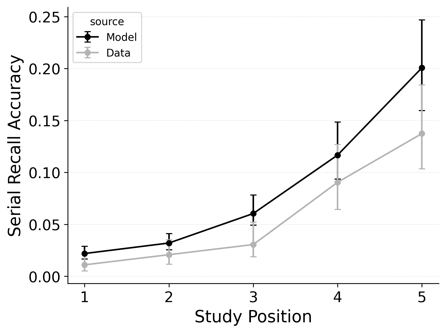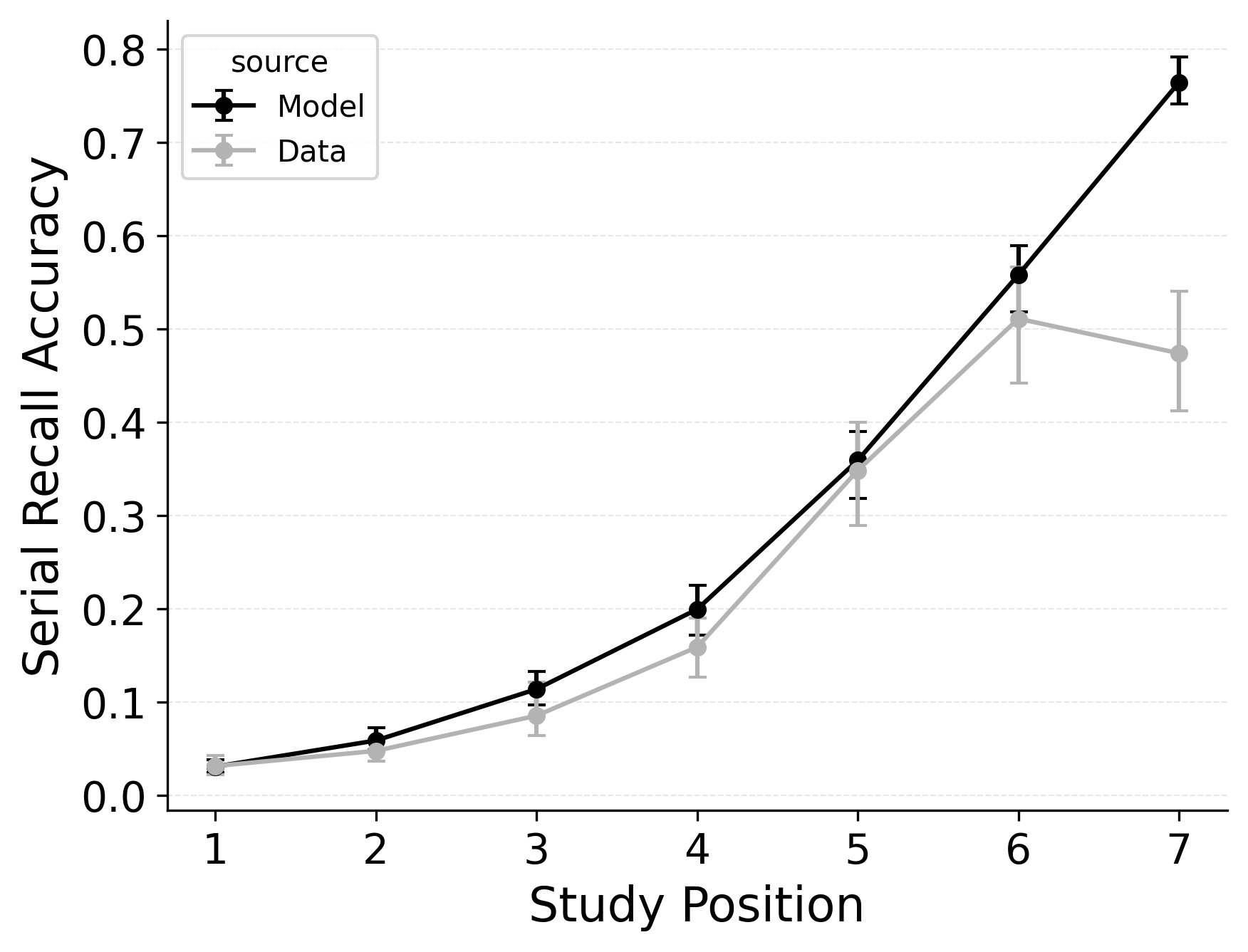 These outcomes reproduce prior results showing that CMR mechanisms needed to balance primacy and recency in free recall become less important in serial recall when the task enforces a fixed forward order (Lohnas 2024; Logan 2021). Because strict serial recall requires reproducing items from the start, it is not necessary to manipulate the \(\beta_\text{start}\) parameter downward from its already maximal value of 1.