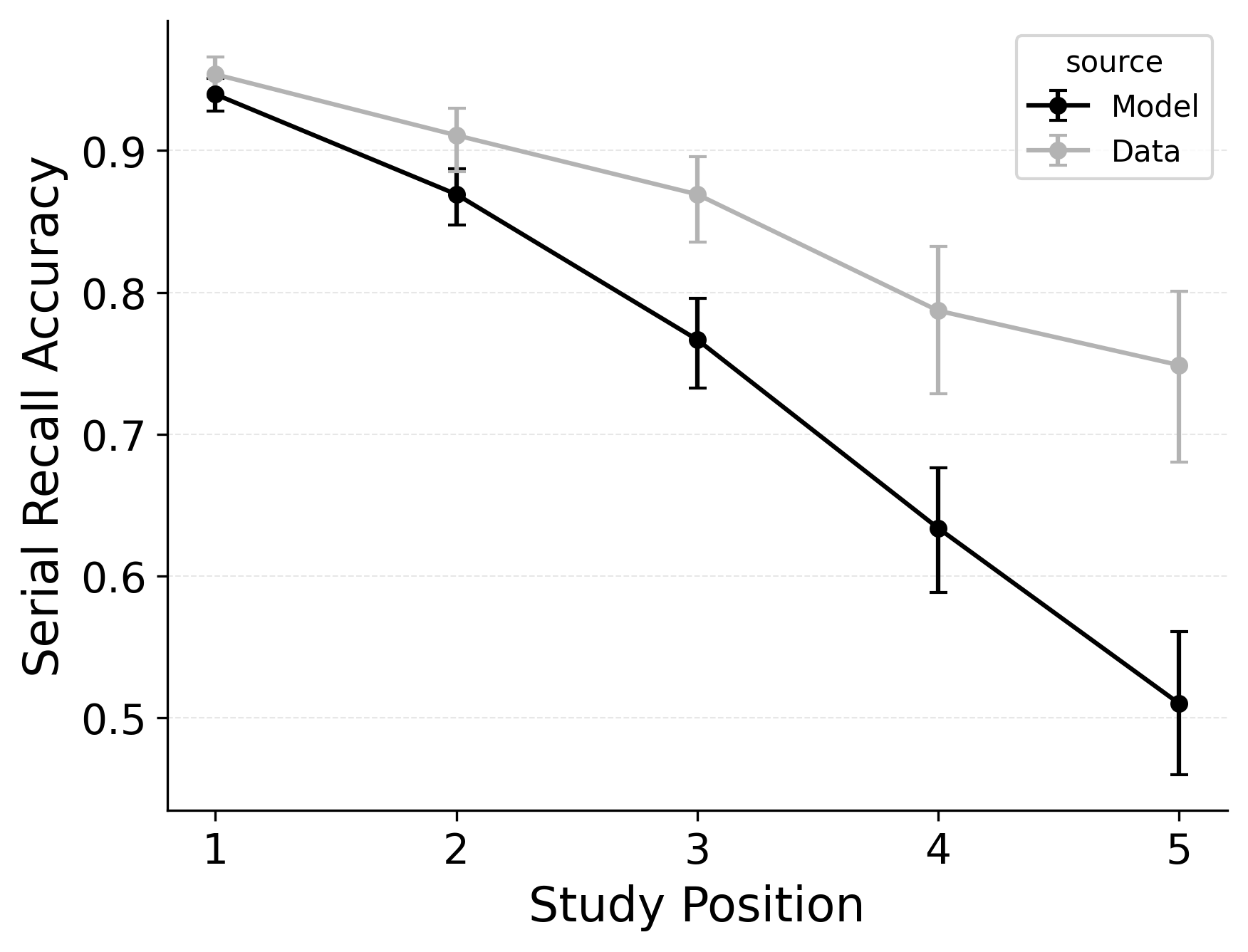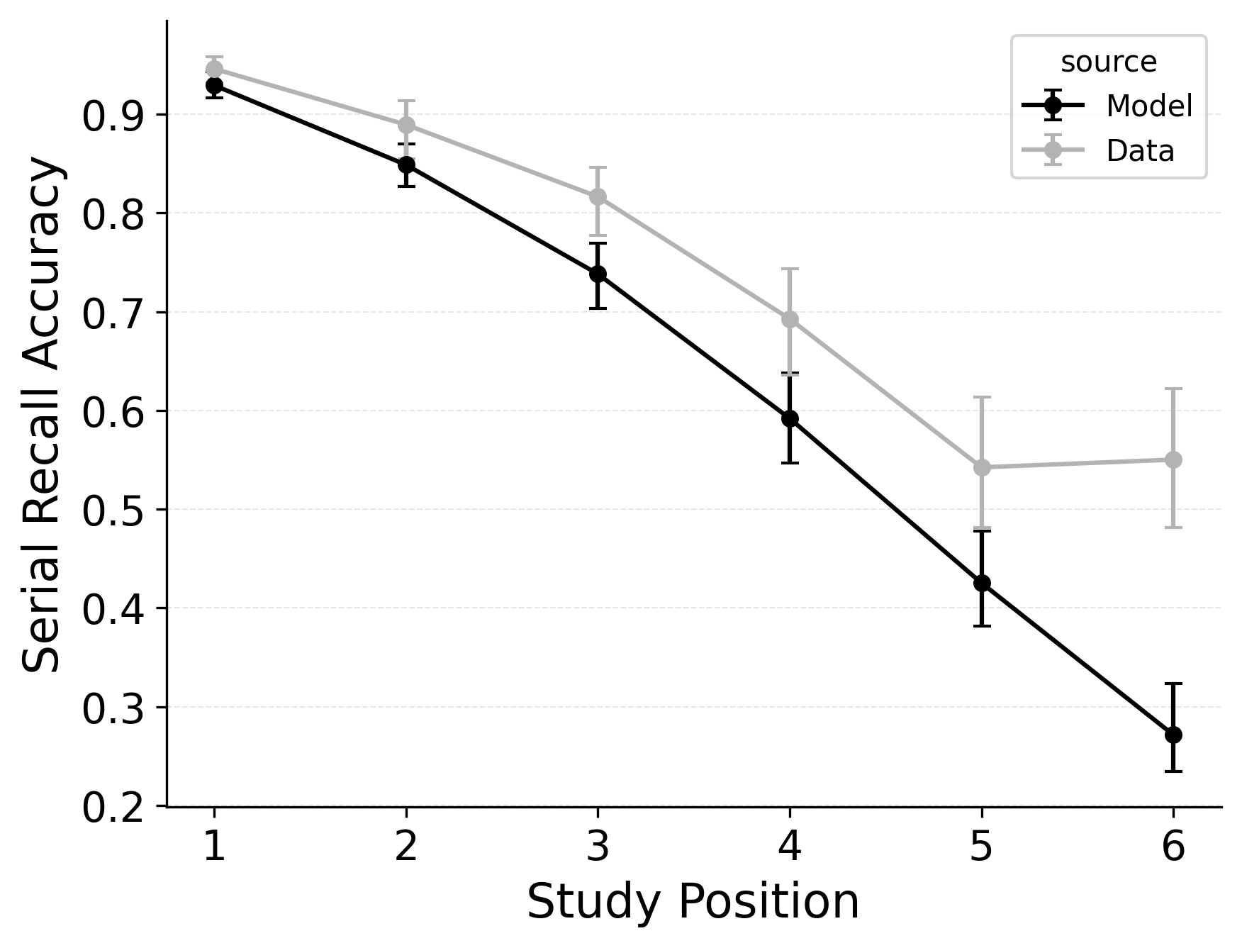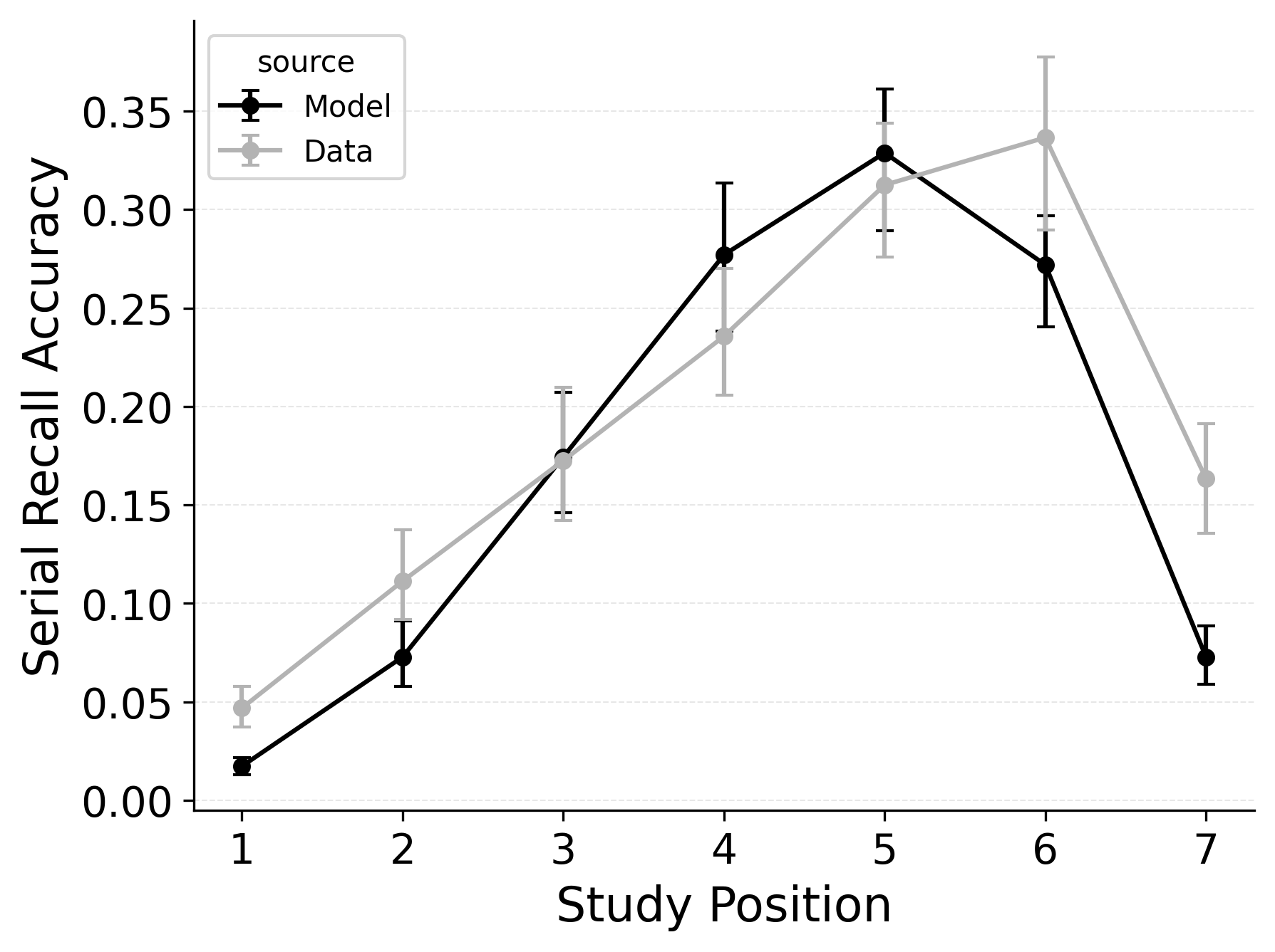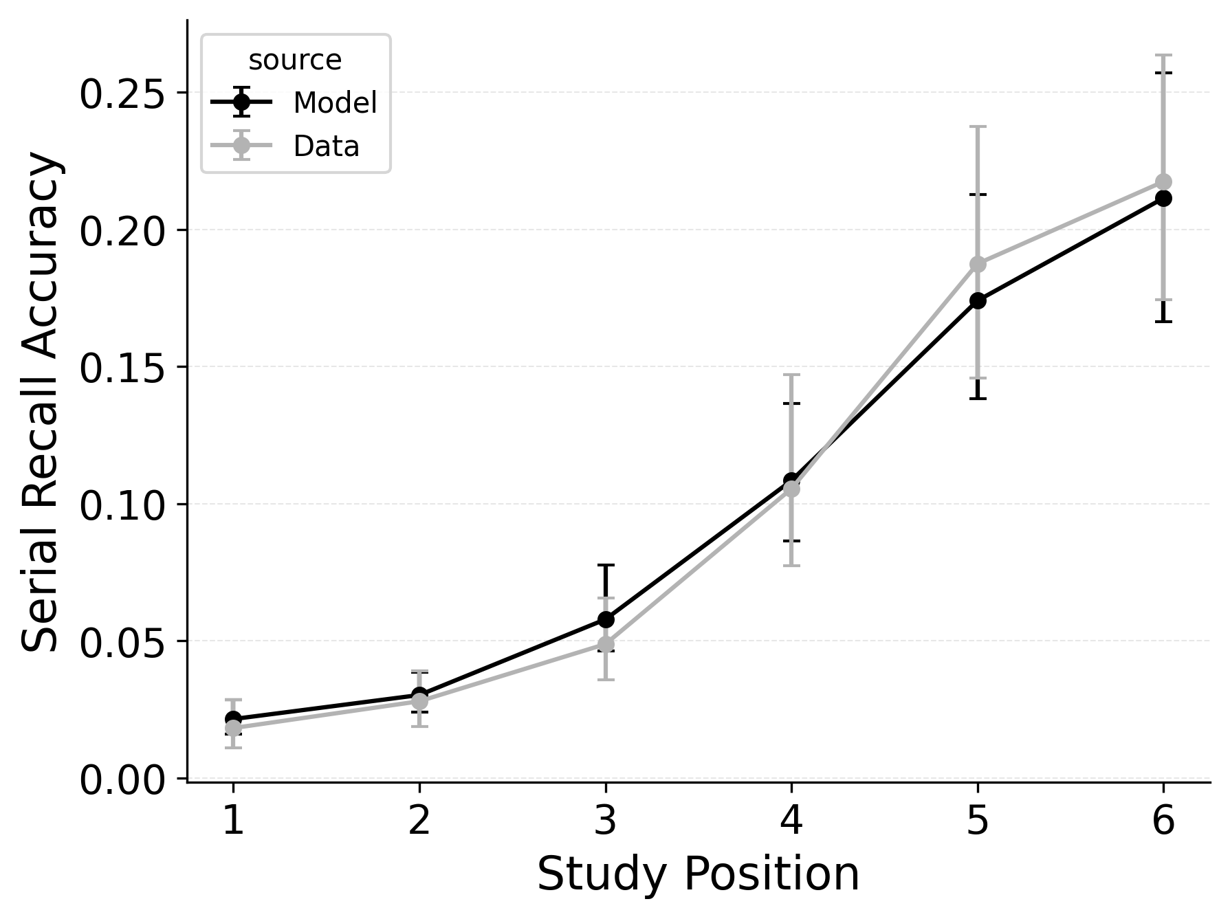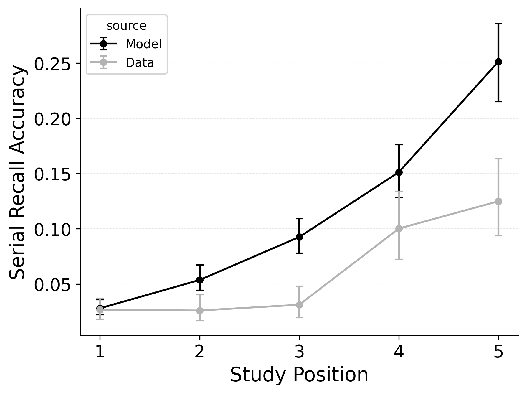 These outcomes reproduce prior results showing that CMR mechanisms needed to balance primacy and recency in free recall become less important in serial recall when the task enforces a fixed forward order (Lohnas 2024; Logan 2021). Because strict serial recall requires reproducing items from the start, it is not necessary to manipulate the \(\beta_\text{start}\) parameter downward from its already maximal value of 1.