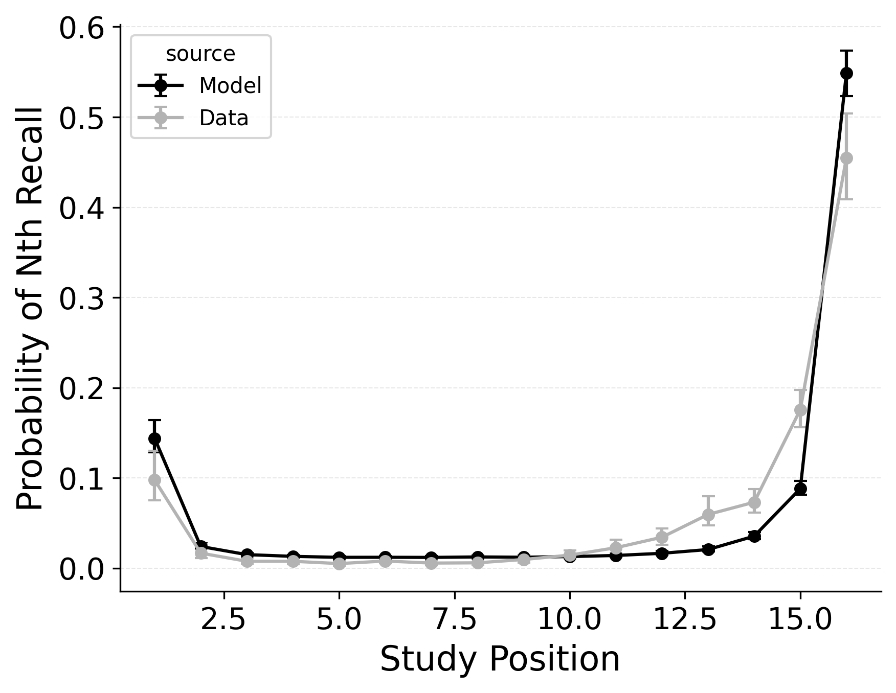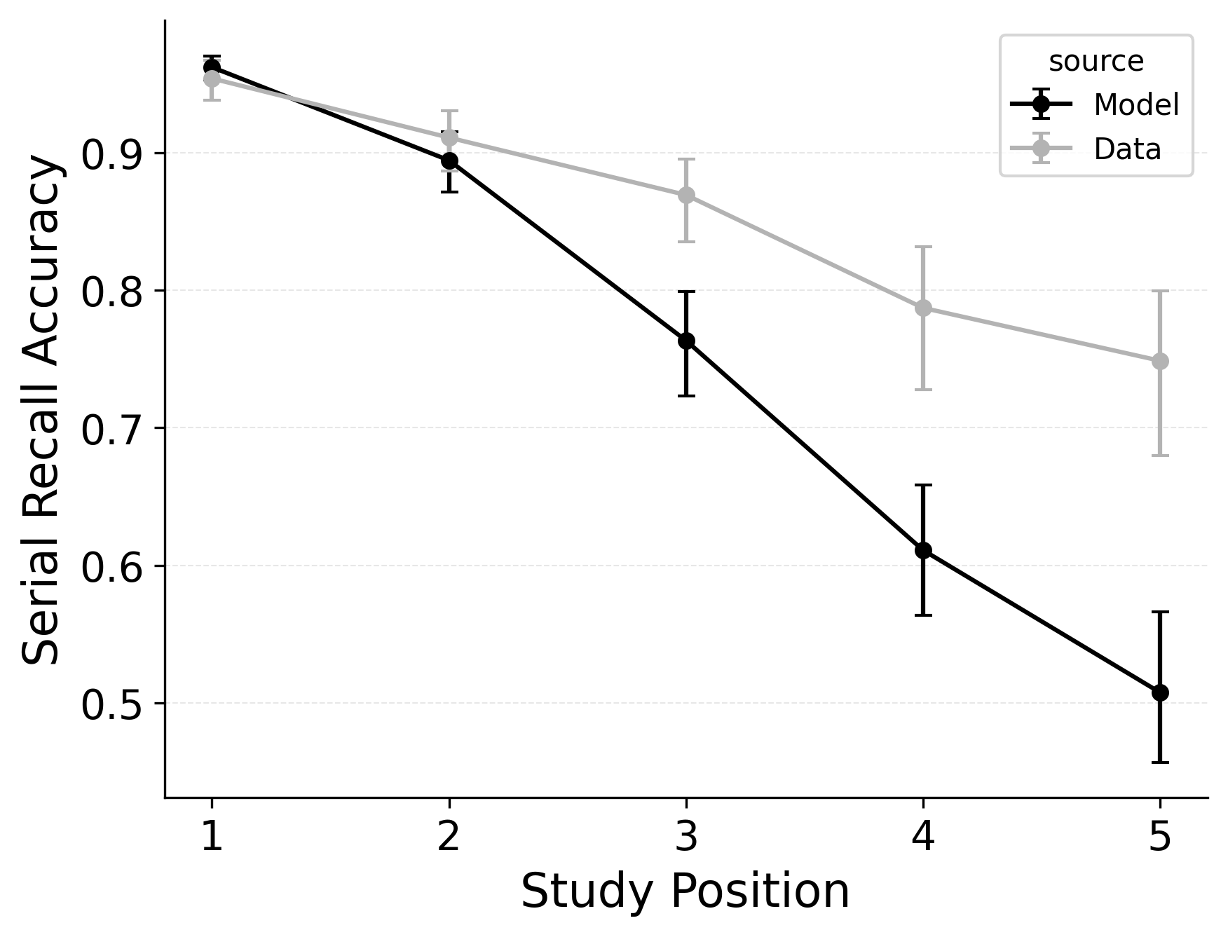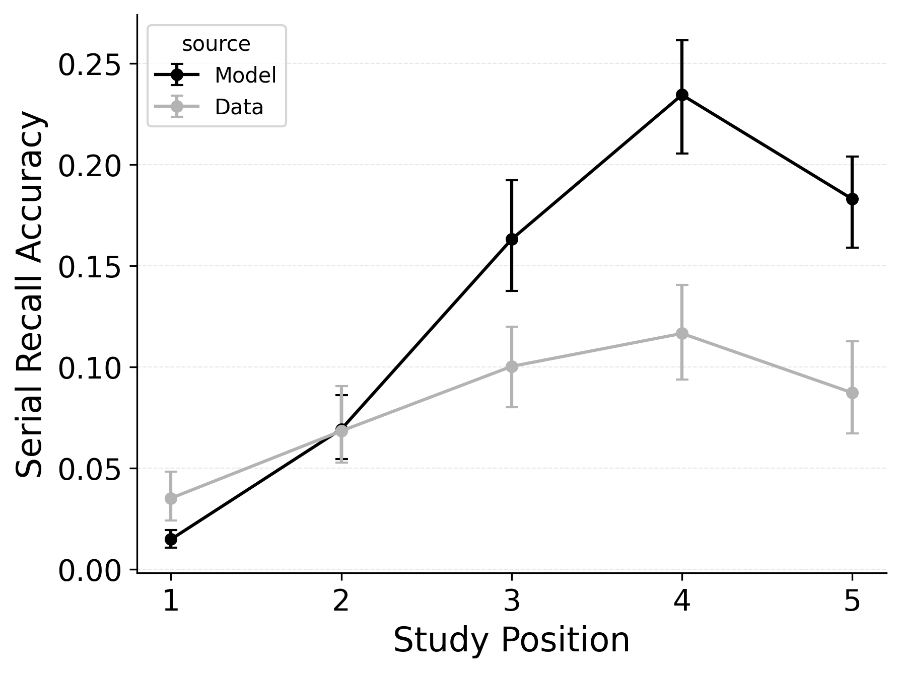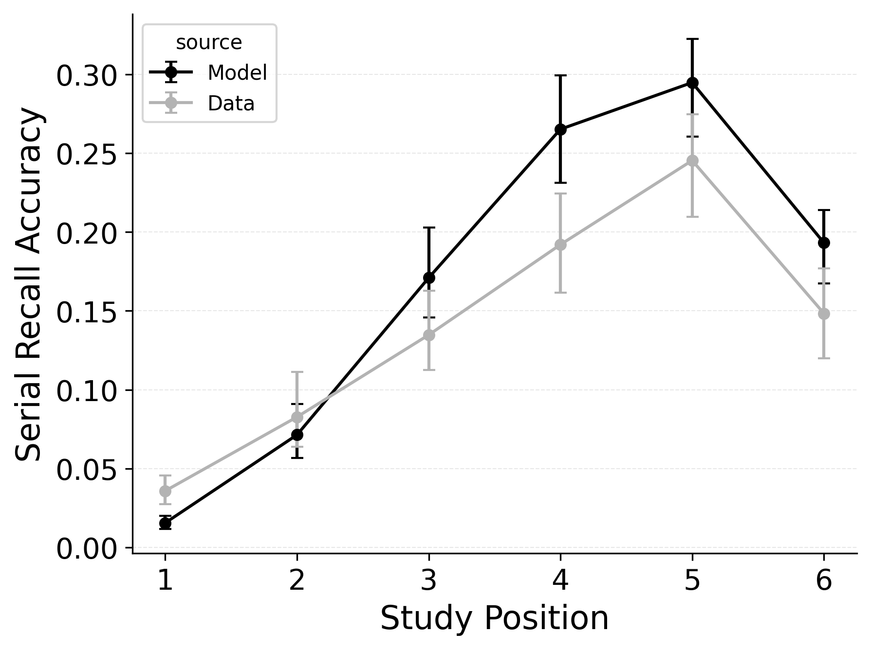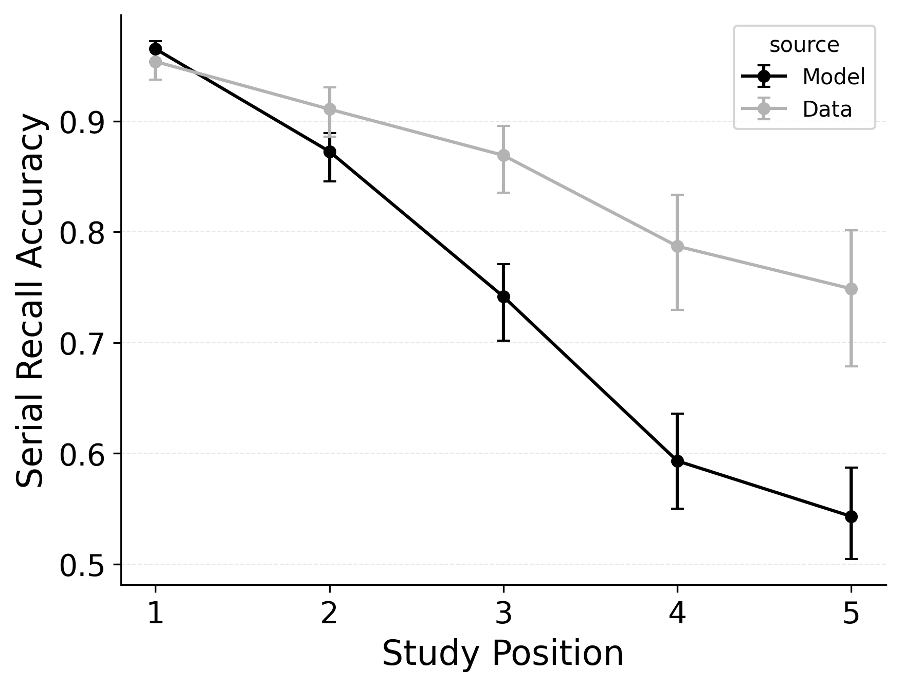 These outcomes reproduce prior results showing that CMR mechanisms needed to balance primacy and recency in free recall become less important in serial recall when the task enforces a fixed forward order (Lohnas 2024; Logan 2021). Because strict serial recall requires reproducing items from the start, it is not necessary to manipulate the \(\beta_\text{start}\) parameter downward from its already maximal value of 1.