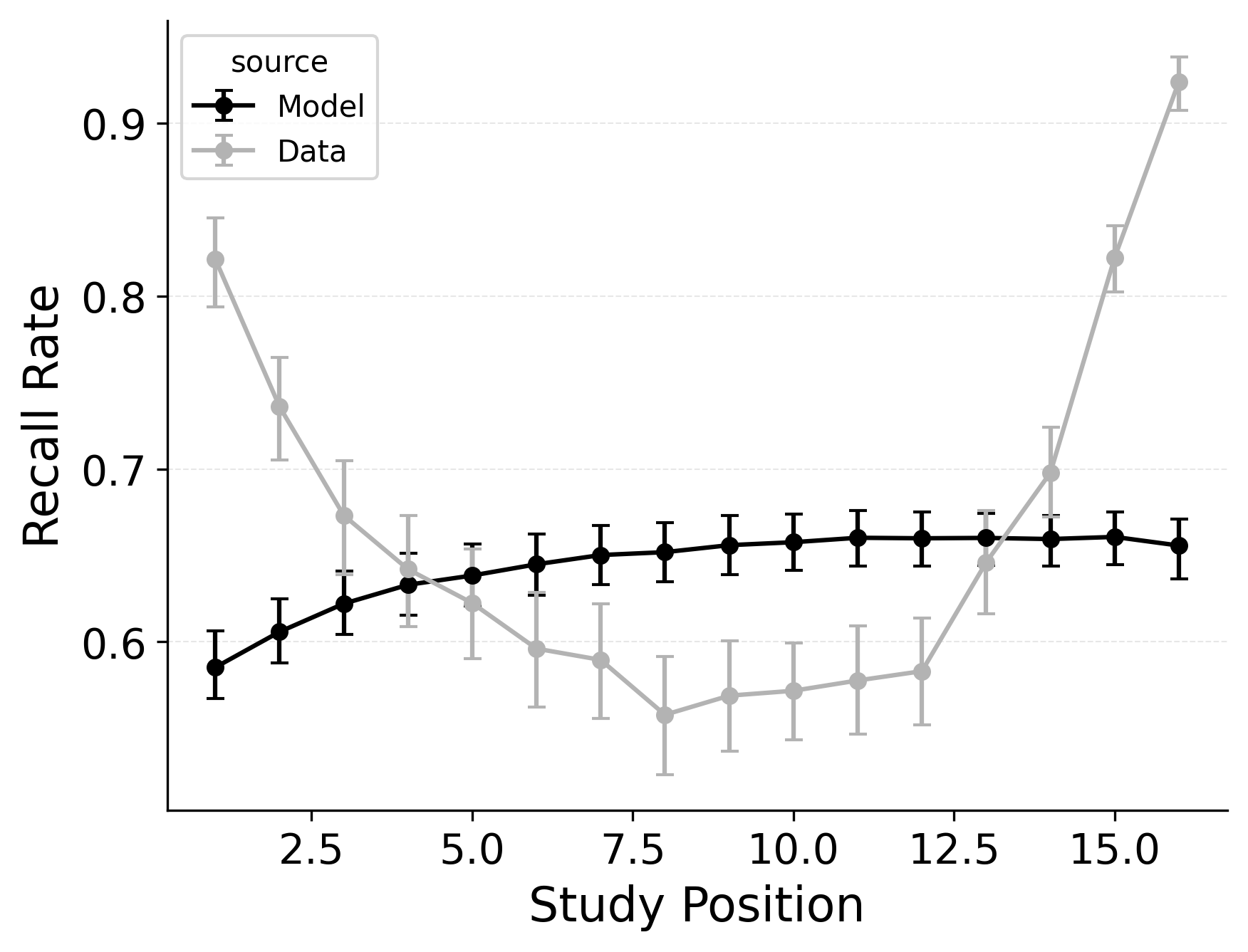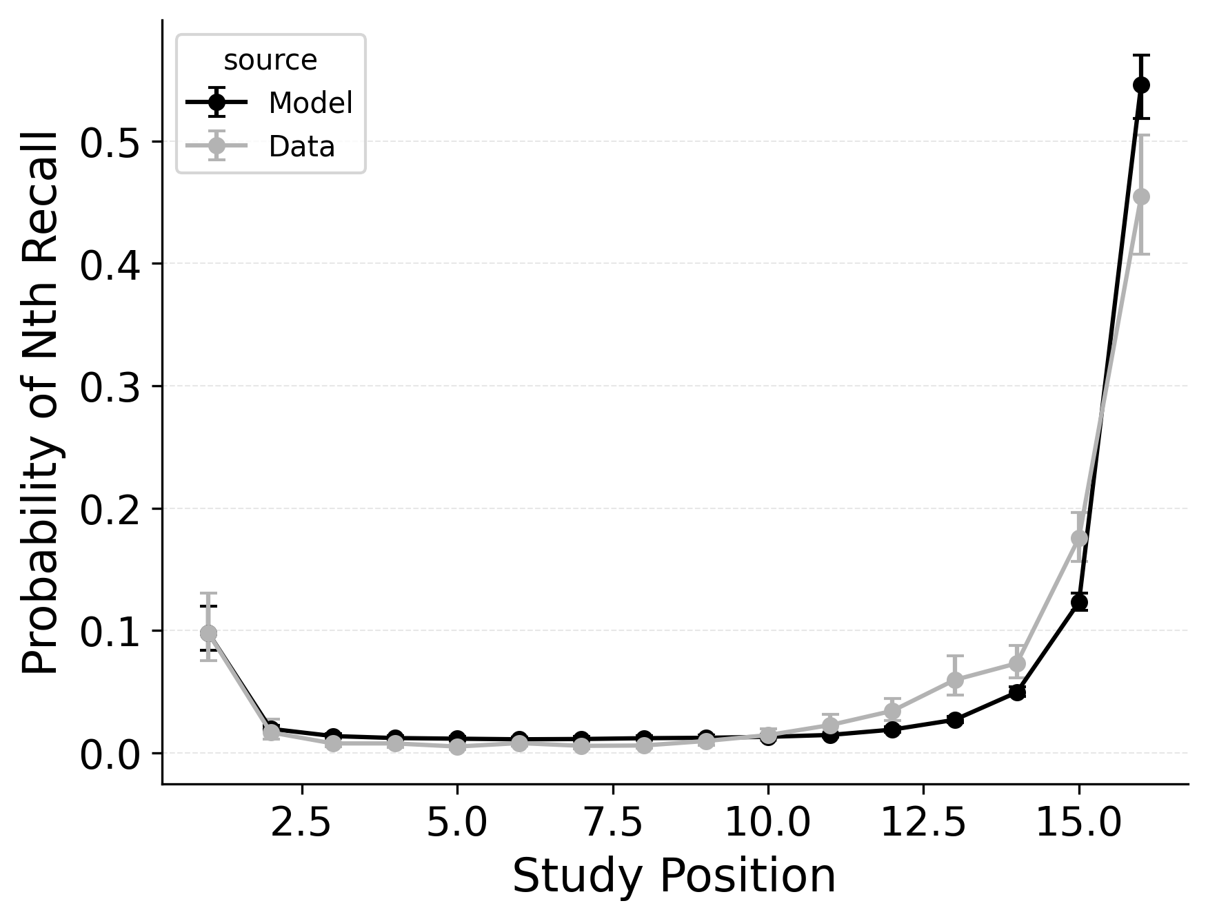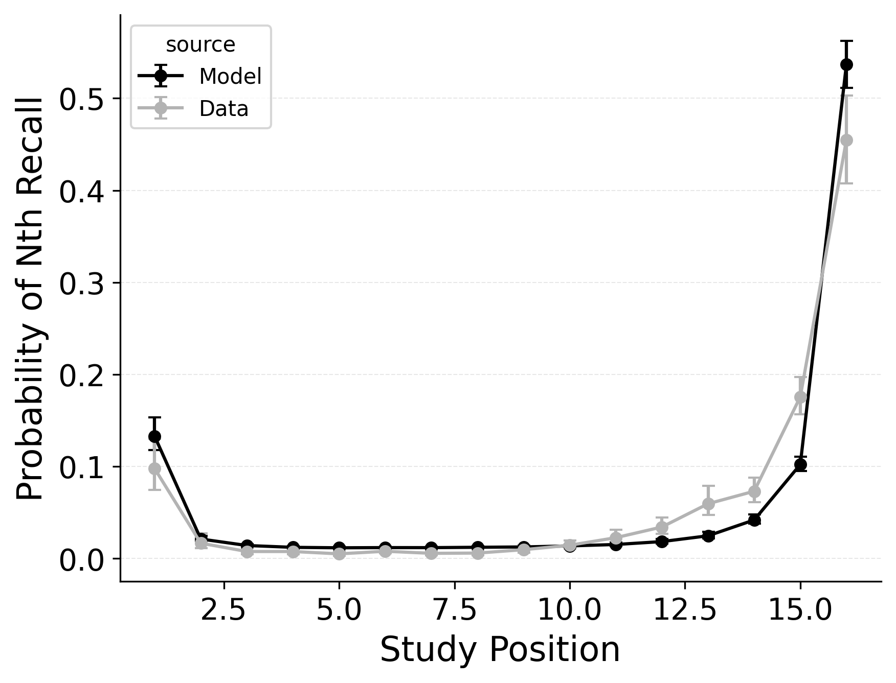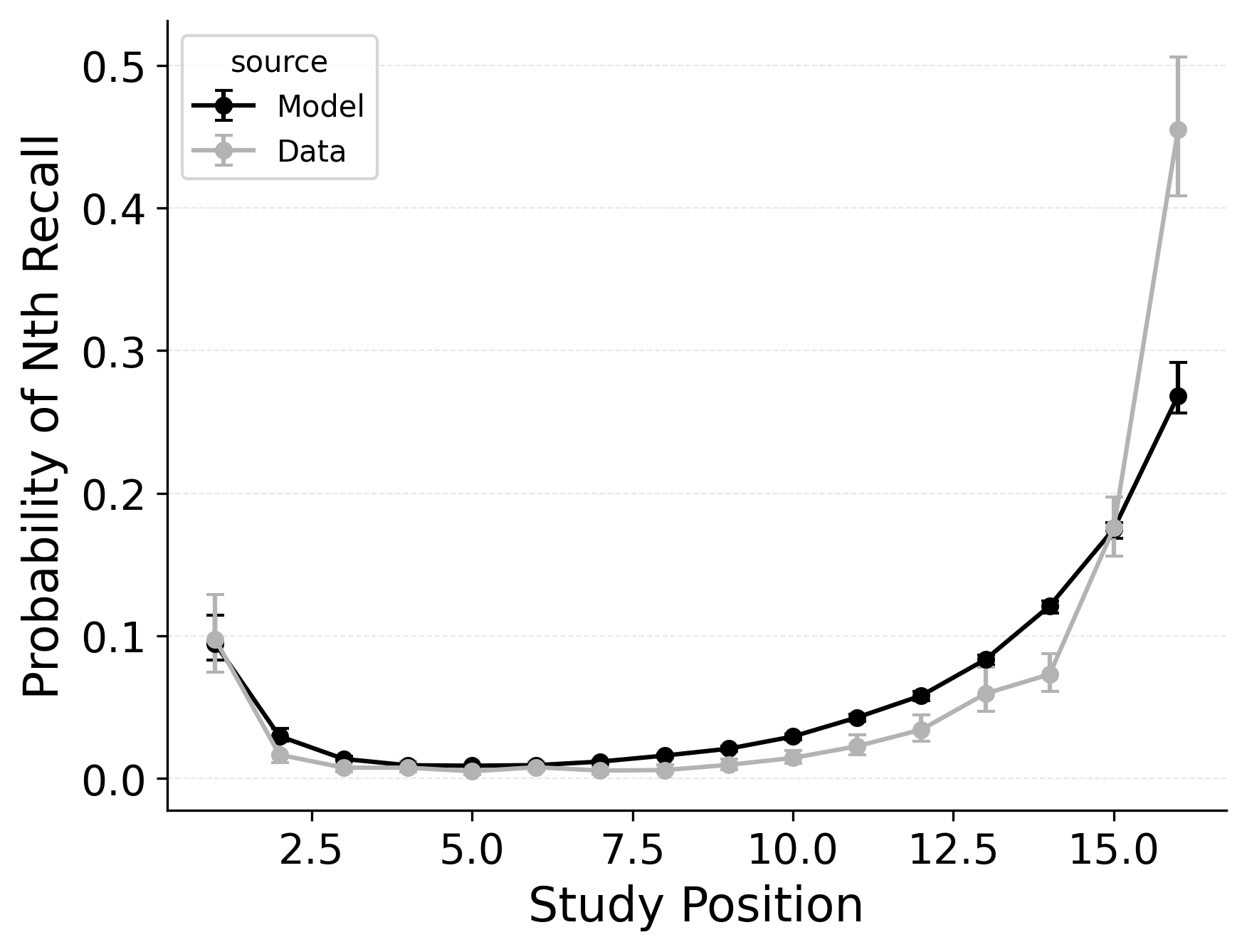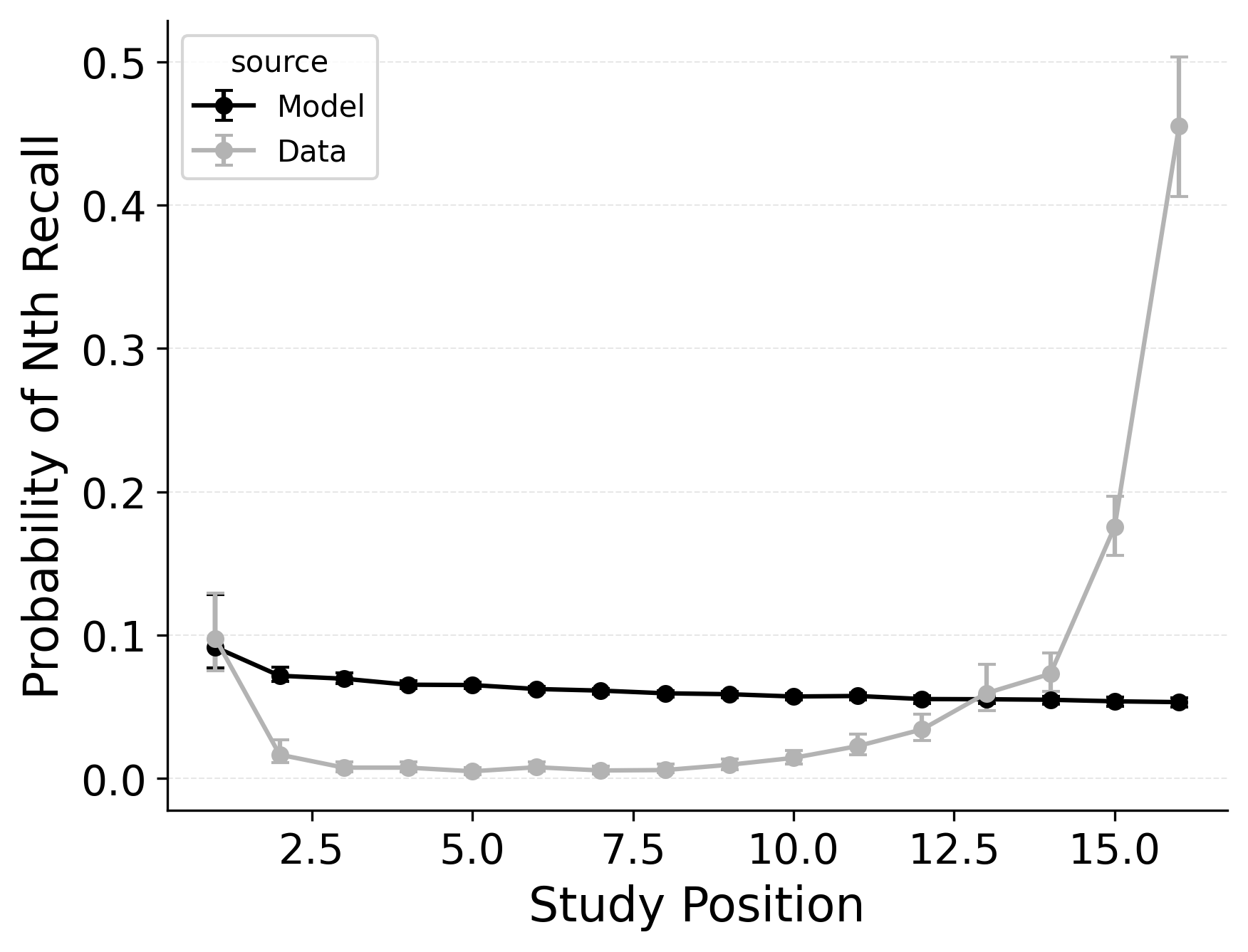 In our free recall evaluation, we found that CMR’s position-based termination mechanism outperformed CRU’s context-based termination mechanism. This is because the latter can lead to premature termination when recall initiates with a strong recency effect, as is common in free recall. However, in our serial recall evaluation, we find that embedding CRU’s context-based termination in CMR improves overall model fits, despite dropping two free parameters Table 3. The standard CMR recall termination mechanism underestimates recall rates for later list items, as shown in Figure 7.