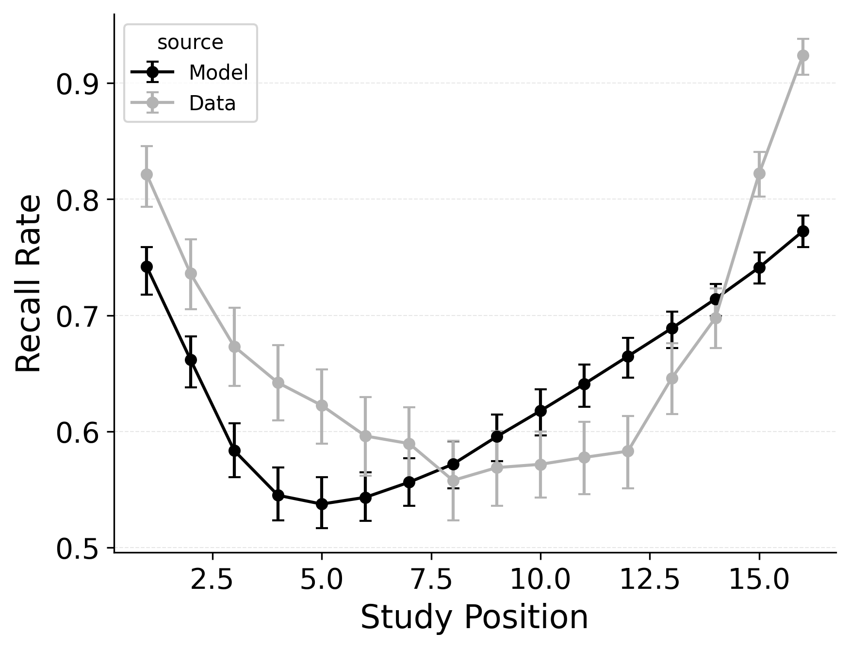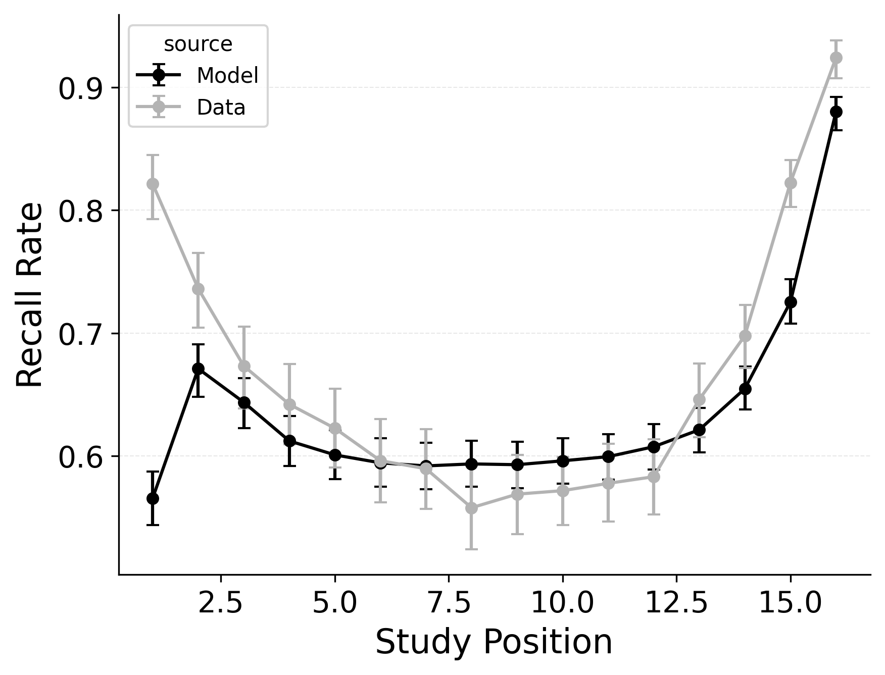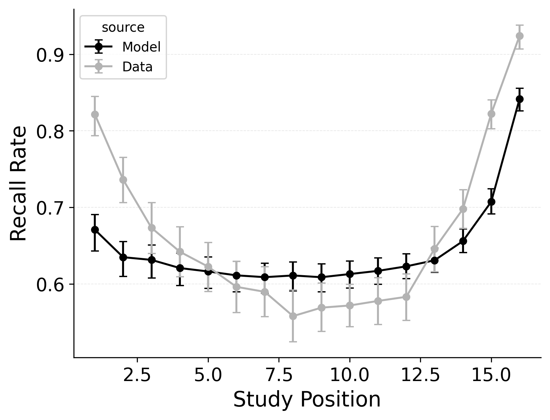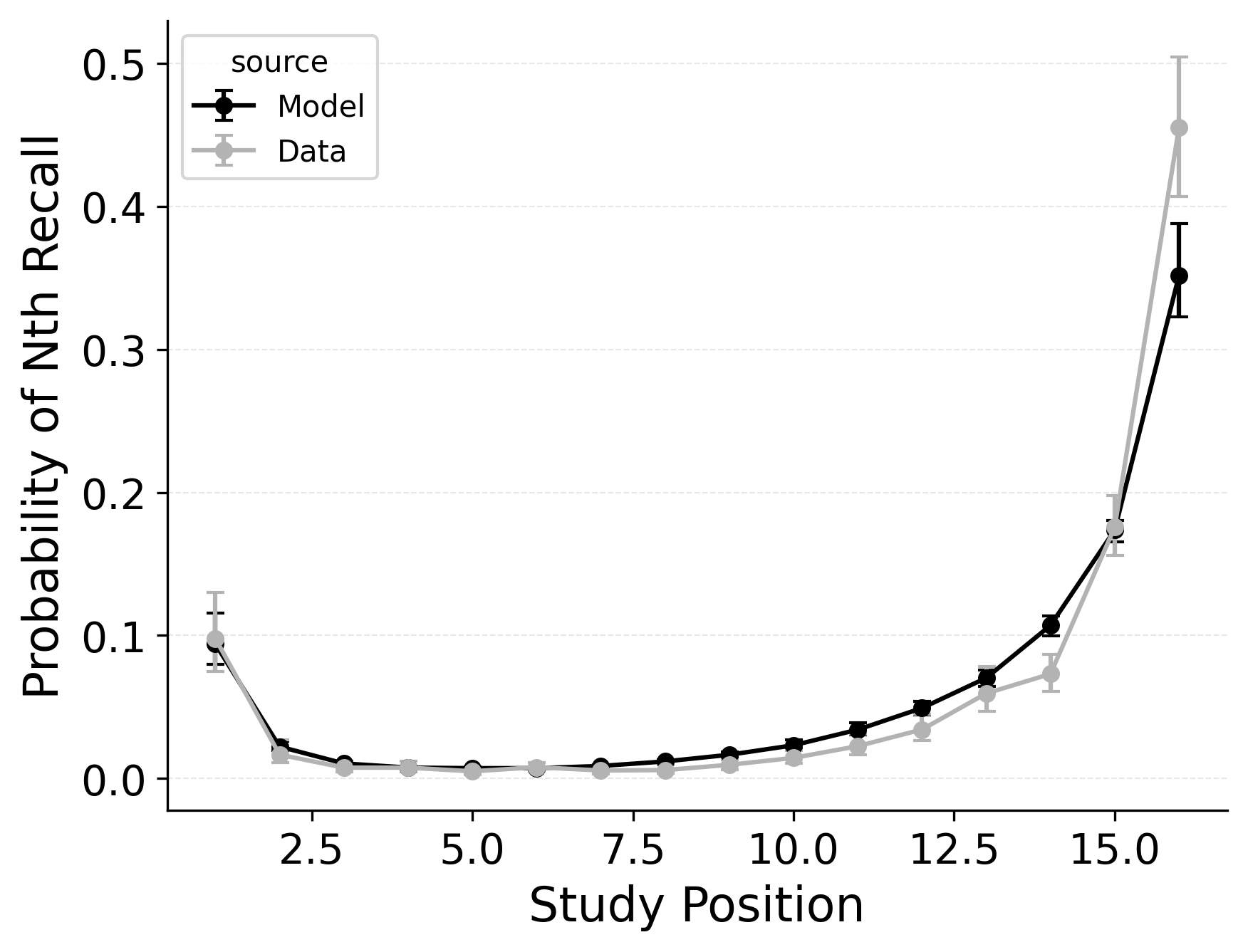 In our free recall evaluation, we found that CMR’s position-based termination mechanism outperformed CRU’s context-based termination mechanism. This is because the latter can lead to premature termination when recall initiates with a strong recency effect, as is common in free recall. However, in our serial recall evaluation, we find that embedding CRU’s context-based termination in CMR improves overall model fits, despite dropping two free parameters Table 3. The standard CMR recall termination mechanism underestimates recall rates for later list items, as shown in Figure 7.