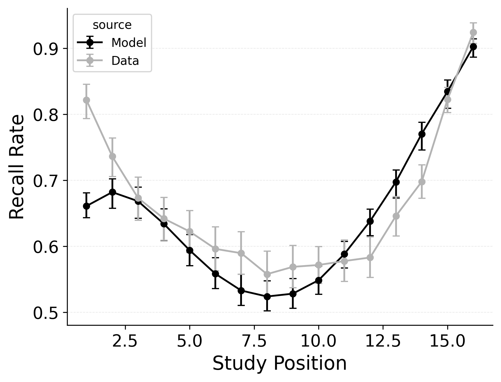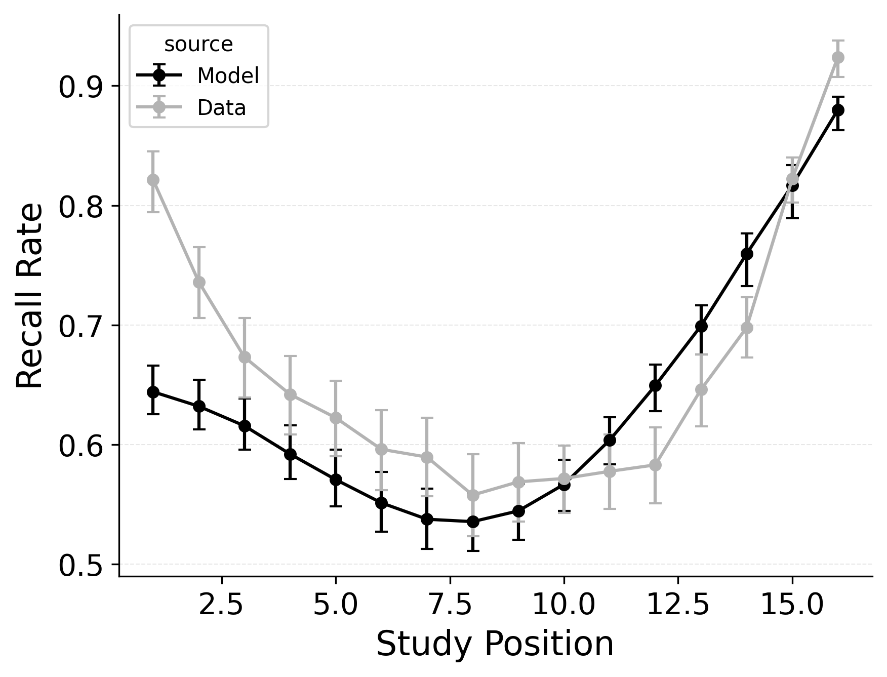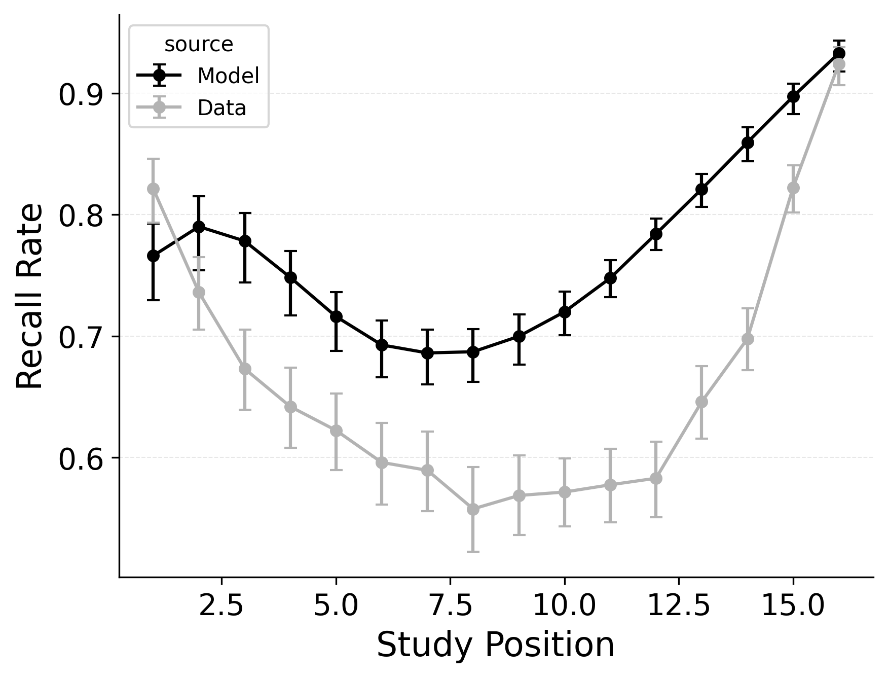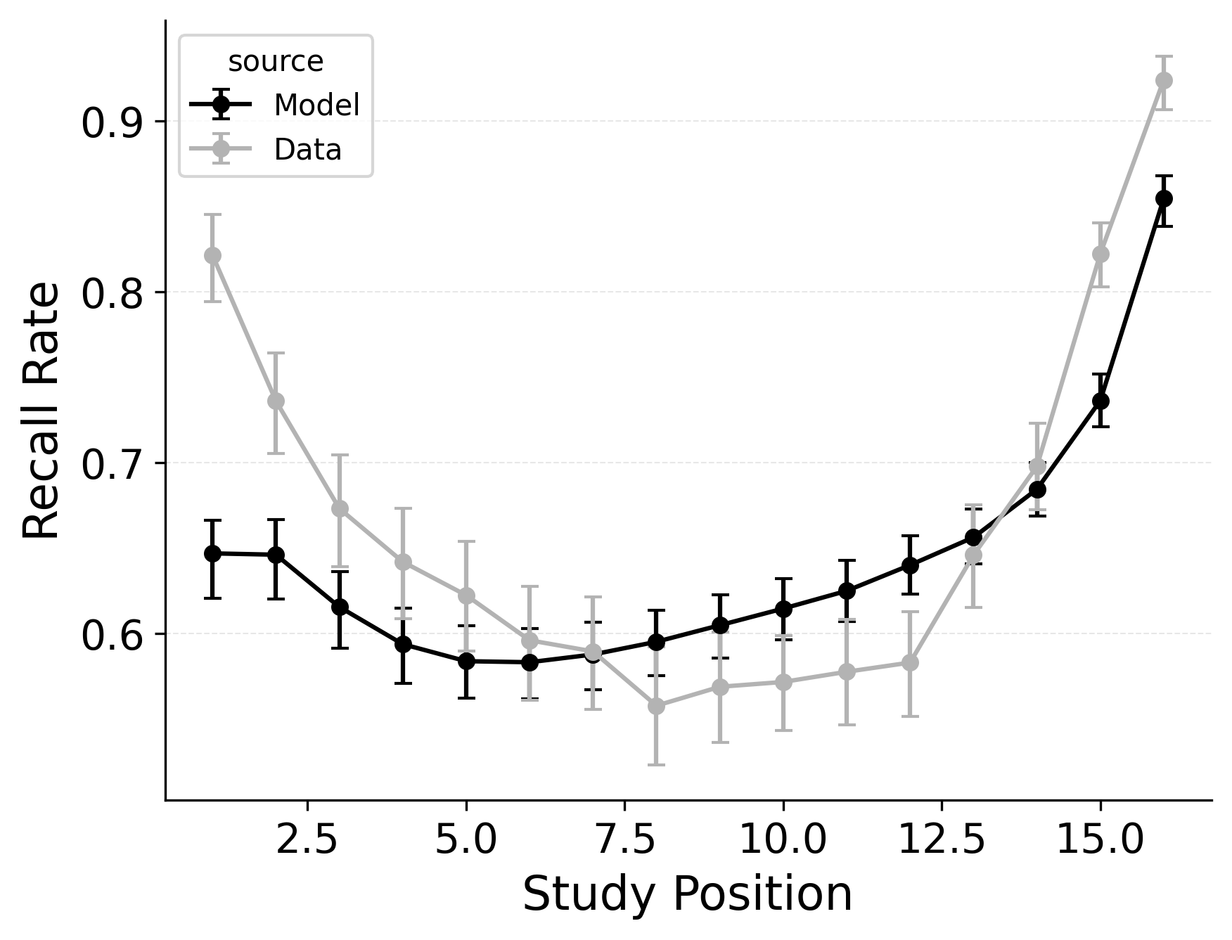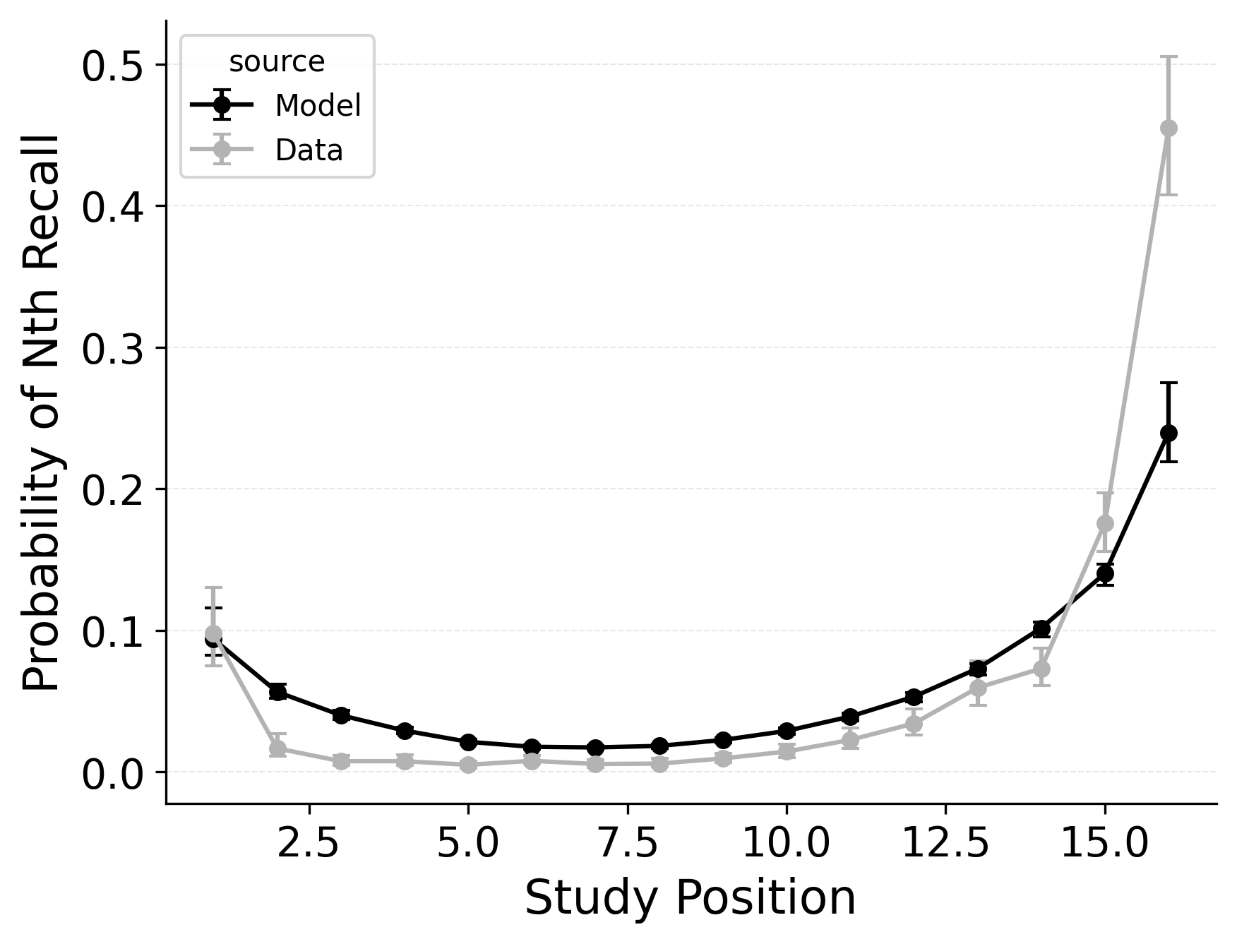 In our free recall evaluation, we found that CMR’s position-based termination mechanism outperformed CRU’s context-based termination mechanism. This is because the latter can lead to premature termination when recall initiates with a strong recency effect, as is common in free recall. However, in our serial recall evaluation, we find that embedding CRU’s context-based termination in CMR improves overall model fits, despite dropping two free parameters Table 3. The standard CMR recall termination mechanism underestimates recall rates for later list items, as shown in Figure 7.