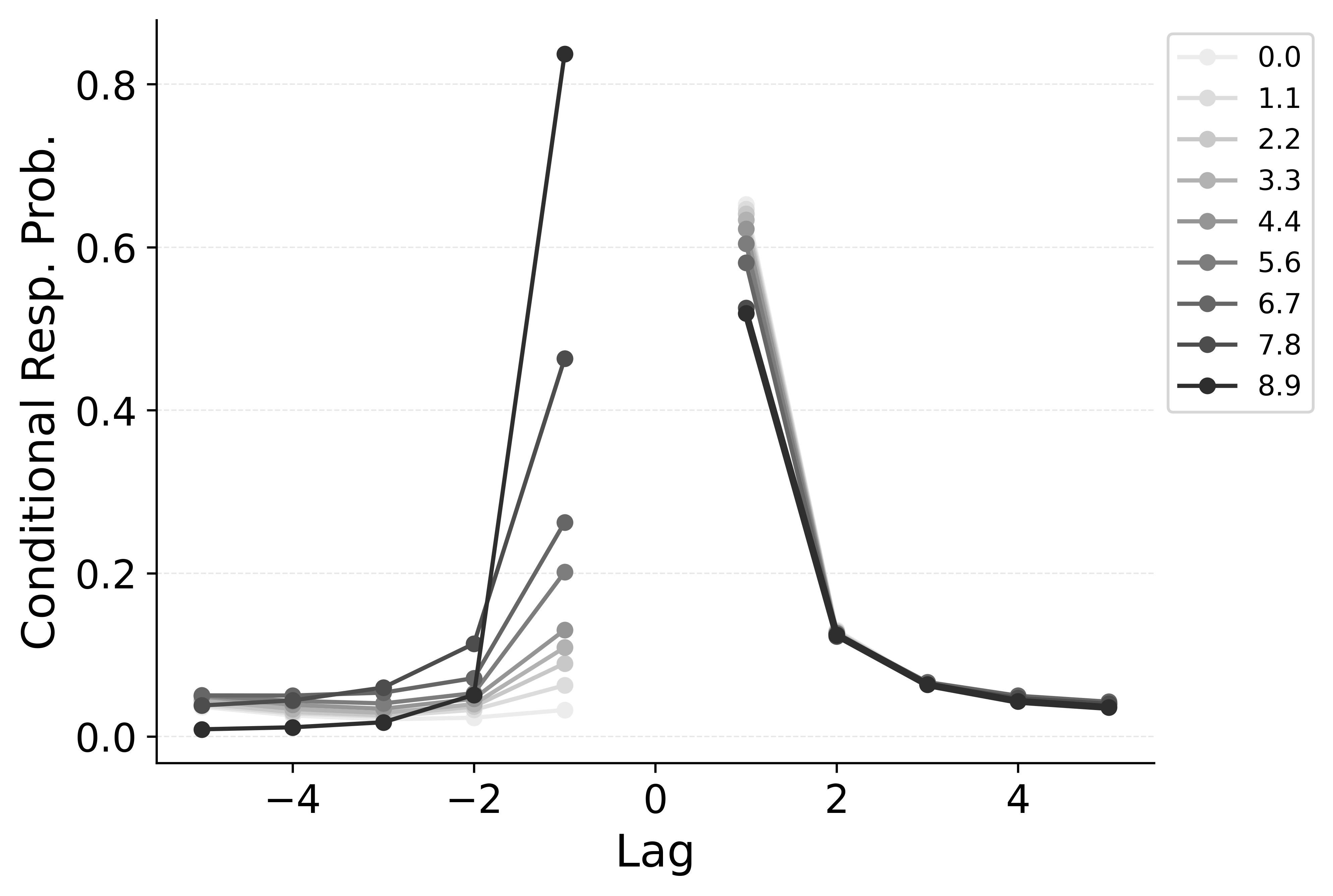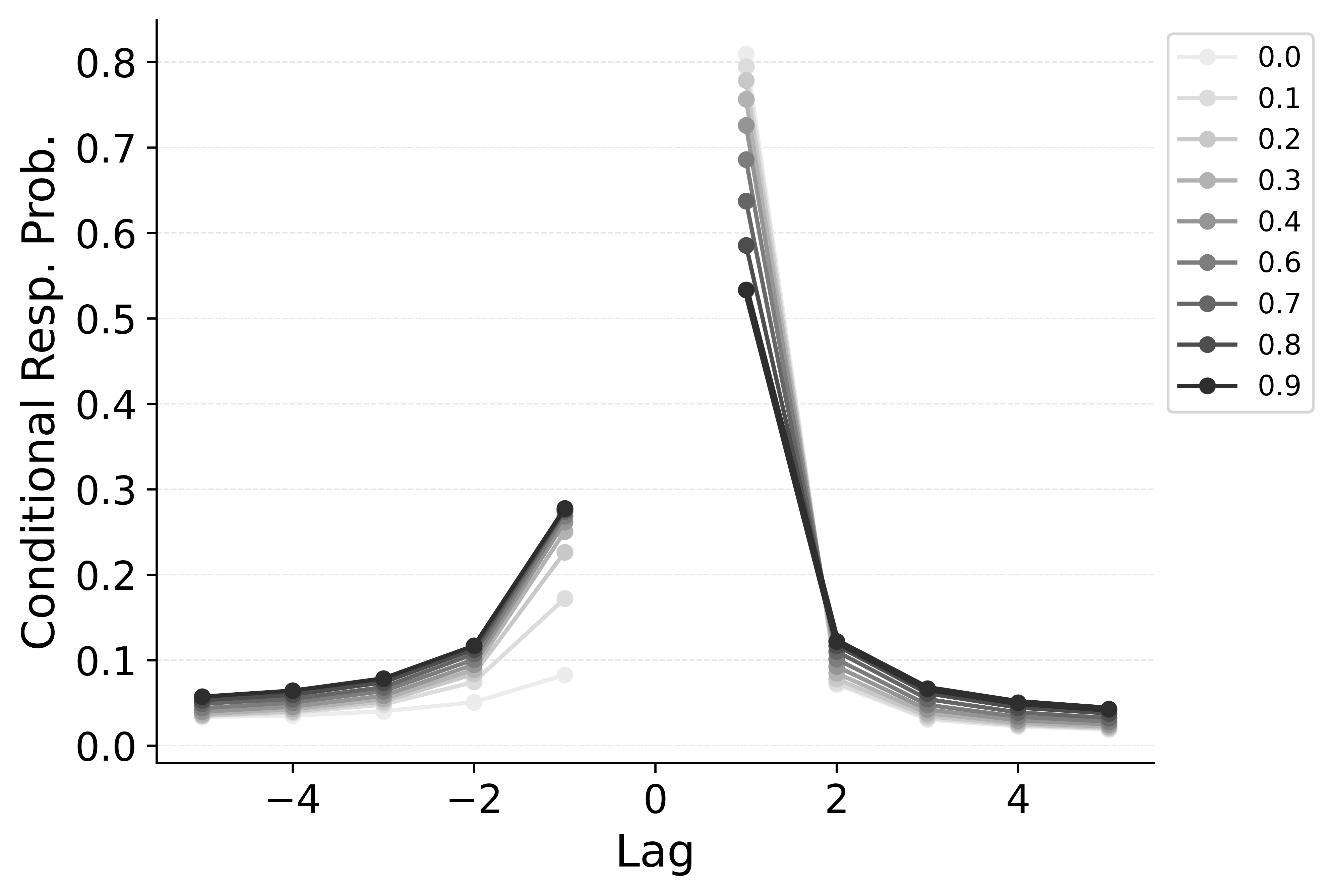 CMR’s \(\delta\) and \(\alpha\) parameters provide a pre-experimental context-to-feature memory that can influence the lag-contiguity effect by tuning the strength of associations from context representations to item representations. When \(\delta\) is much higher than \(\alpha\), the lag-contiguity effect is facilitated by favoring neighbors of the just-recalled item in the competition between items during retrieval. Alternatively, setting \(\delta\) to match \(\alpha\) or to zero can flatten the lag-contiguity effect by making all items equally likely to be activated by a context feature associated with a just-recalled item. When \(\gamma\) is configured to 0 – as it effectively is in CRU – tuning \(\delta\) no longer influences rates of backward transitions in the lag-contiguity effect, as the experimental associations that would facilitate these backward transitions are no longer present. Figure 5 (right) illustrates the impact of shifting \(\delta\) on the shape of the lag-CRP for CMR when \(\gamma\) is not set to 0. The simulation was configured similarly to the previous section, using parameters fit to Healey and Kahana (2014), and shifting \(\delta\) from 0 to 8.9 in increments of 1. When \(\gamma\) is configured to non-zero values, higher values of \(\delta\) can simultaneously drive both forward and backward transitions in the lag-contiguity effect, reducing the rate of more distant transitions while increasing the rate of closer transitions.