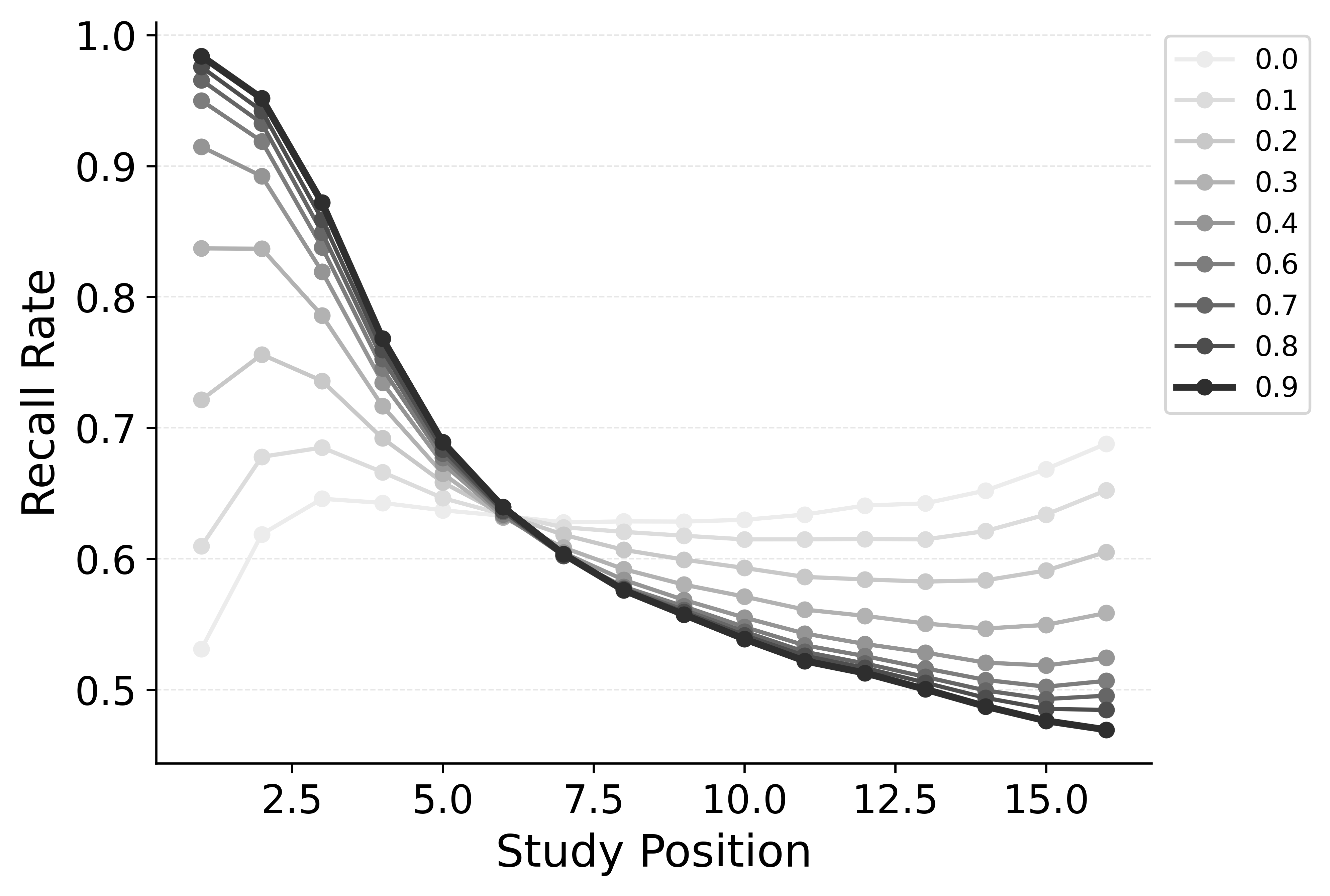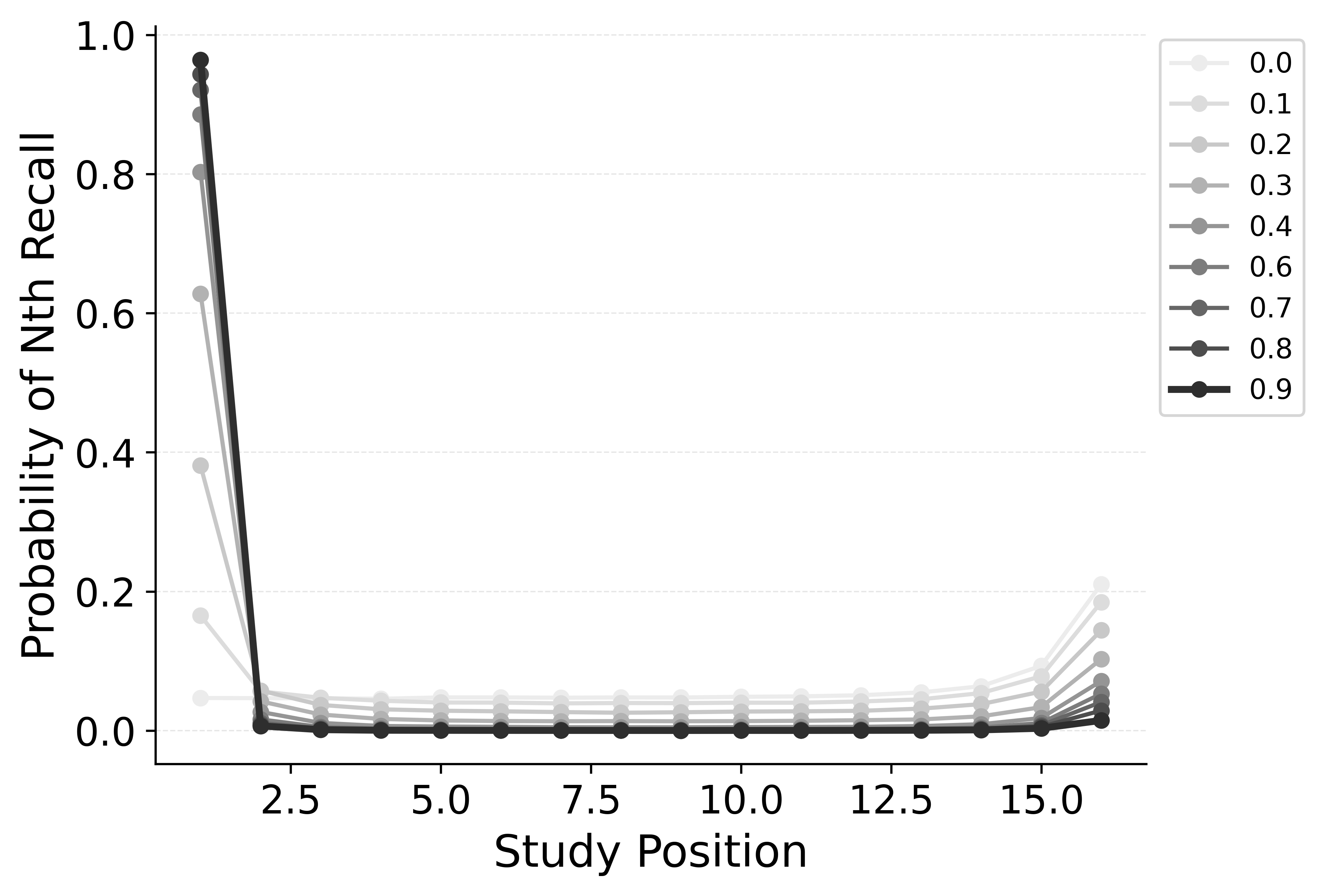 Along with modulating memorability as a function of serial position, the CRU and CMR models also address serial position effects by configuring the state of context when retrieval begins. In CMR, the end-of-list contextual state can be modified by retrieving and integrating the start-of-list contextual state according to a special integration rate parameter \(\beta_\text{start}\) before initiating retrieval (Healey and Wahlheim 2024). When this integration rate is zero, the contextual cue primarily targets items near the end of the study list, and when it is high, the cue targets items near the beginning of the study list. Hence CMR can flexibly shift recall initiation to either early or late list items, whereas CRU always begins from the start-of-list context.