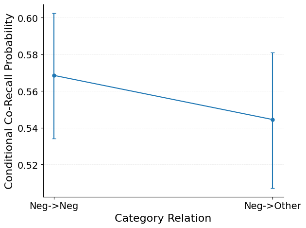 Conditional co-recall by category measures how the probability that a neighbor was recalled depends on whether it belongs to the same or a different category as a recalled anchor item. For a given reference category, each recalled anchor from that category contributes to two bins: same-category neighbors and different-category neighbors.