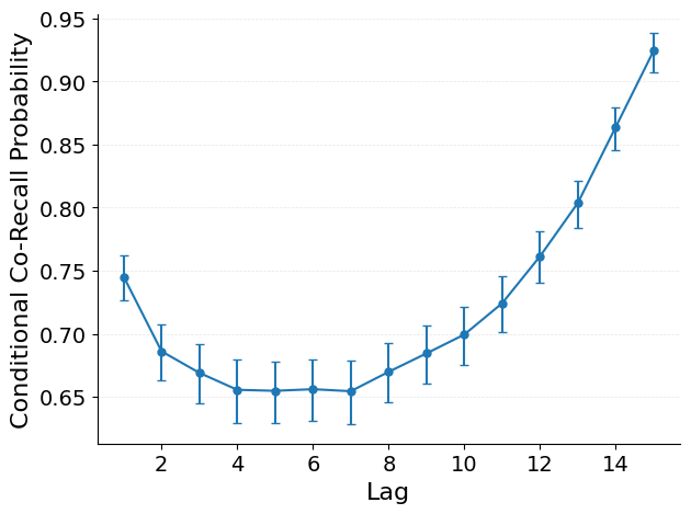 Conditional co-recall by lag measures the probability that a neighbor \(d\) positions away in the study list was recalled, given that the anchor position was recalled, ignoring recall order. For each recalled anchor at position \(i\), we check whether the item at position \(i + d\) was also recalled on the same trial.