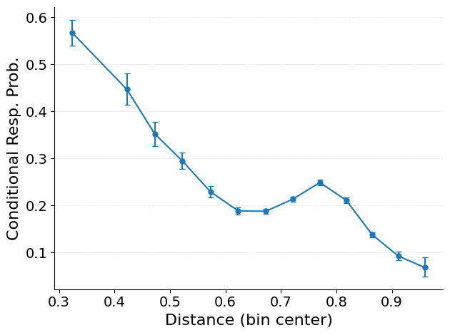 The distance-conditioned response probability (Distance-CRP) replaces serial lags with semantic or spatial distances supplied by the caller. Each recall transition is assigned to a distance bin and availability is tallied as the set of bins containing at least one unrecalled item at the moment of choice.