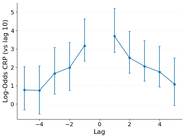 data_path — path to an HDF5 file containing a RecallDataset.figure_dir — directory for saving figures.figure_str — base filename for the saved figure. Leave empty to display without saving.ylim — y-axis limits as a tuple, or None for automatic scaling.trial_query — a Python expression evaluated against the dataset to select trials.max_lag — maximum lag to display on the x-axis.reference_lag — the lag used as the zero baseline for log-odds subtraction.epsilon — small constant clamping CRP values away from 0 and 1 to avoid infinite log-odds.size — maximum number of study positions a single item can occupy.confidence_level — confidence level for subject-wise error bars.