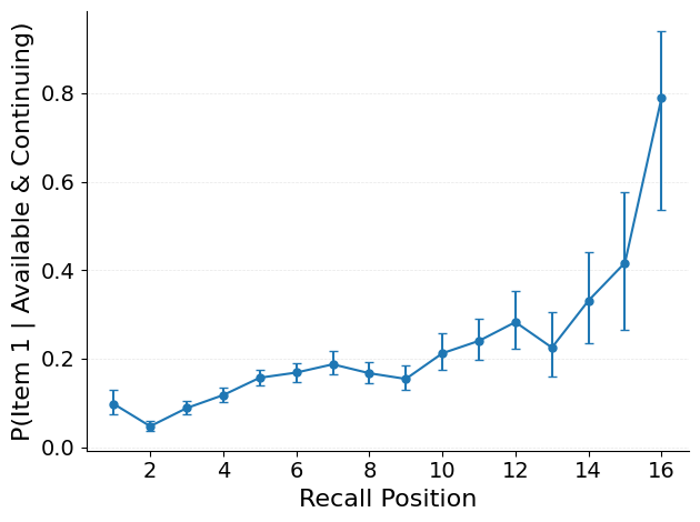 if mode =="conditional": plot_conditional_nth_item_recall_curve(data, trial_mask, query_study_position=query_study_position, confidence_level=confidence_level)else: plot_simple_nth_item_recall_curve(data, trial_mask, query_study_position=query_study_position, confidence_level=confidence_level)if ylim isnotNone:for ax in plt.gcf().axes: ax.set_ylim(ylim)save_figure(figure_dir, figure_str)