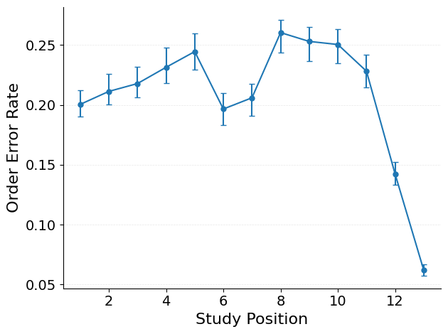 An order error occurs when a participant recalls a list item at the wrong output position. The item was on the study list but is produced in a serial position that does not match where it was originally studied. The order error rate curve plots these transposition errors at each study position.