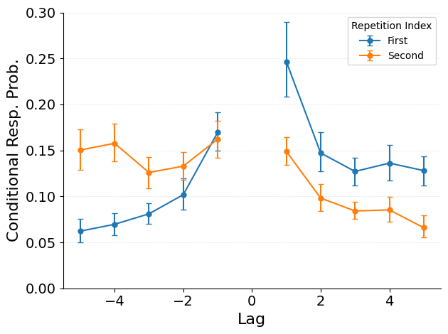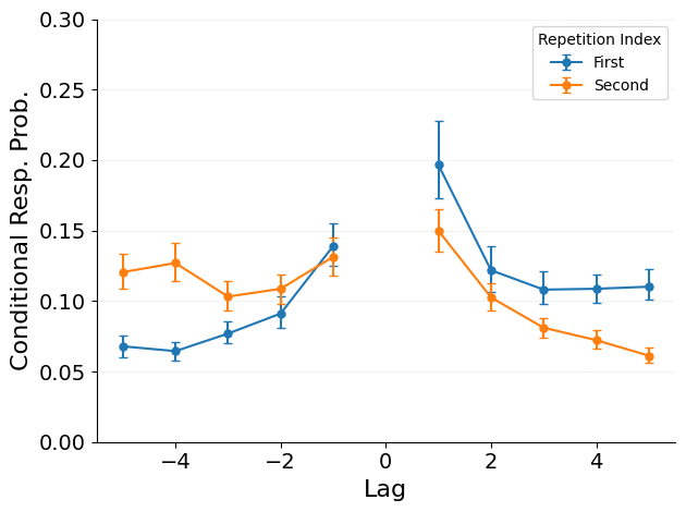 The repetition Lag-CRP extends the standard Lag-CRP analysis to study lists containing repeated items. For each recall of a repeated item, the analysis separately tabulates lag transitions relative to each of the item’s study positions. This produces one CRP curve per presentation index, revealing whether transitions from repeated items cluster around the first or second occurrence.